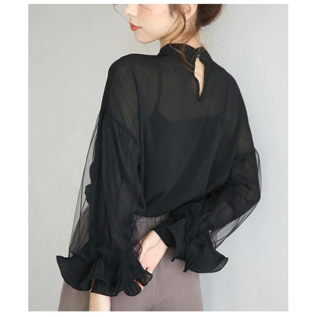 トップス レディース シフォンブラウス カットソー プルオーバー スタンドカラー 立襟 フリル 長袖 バルーンスリーブ ボリューム袖 ドロップショルダー 大人可愛い きれいめ カジュアル 大人 上品 おしゃれ お洒落 存在感 大人女子 かっこいい こなれ感 抜け感 ふんわり