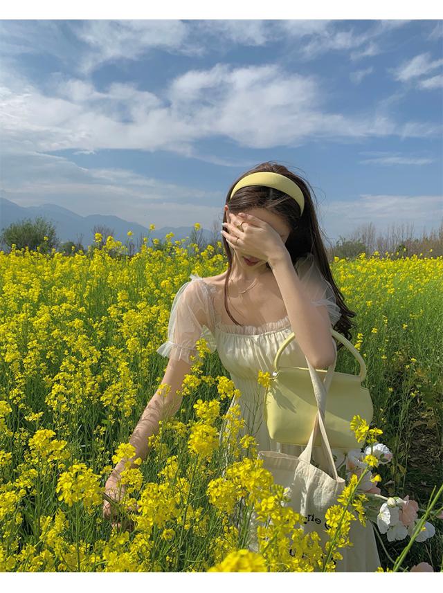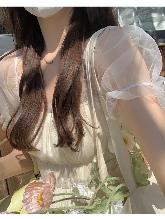 パフスリーブのシースルー袖とスクエアネックのメロウフリルがエレガントな1枚◎