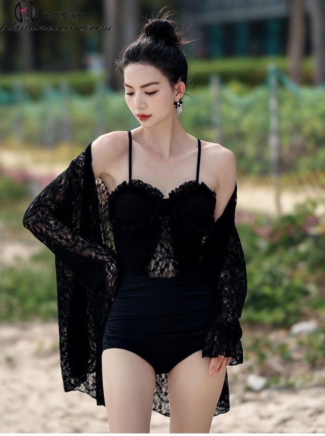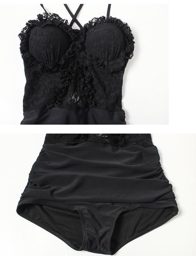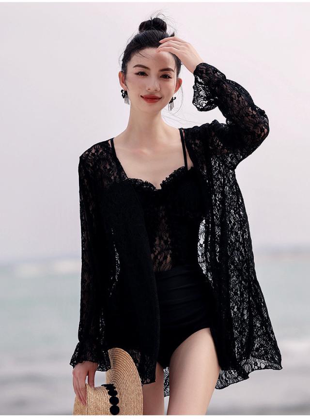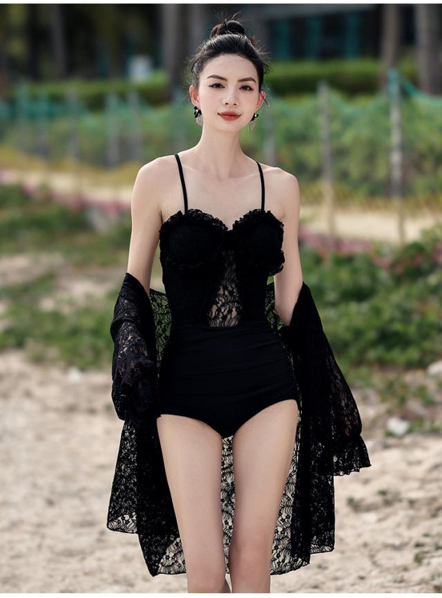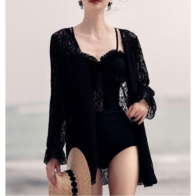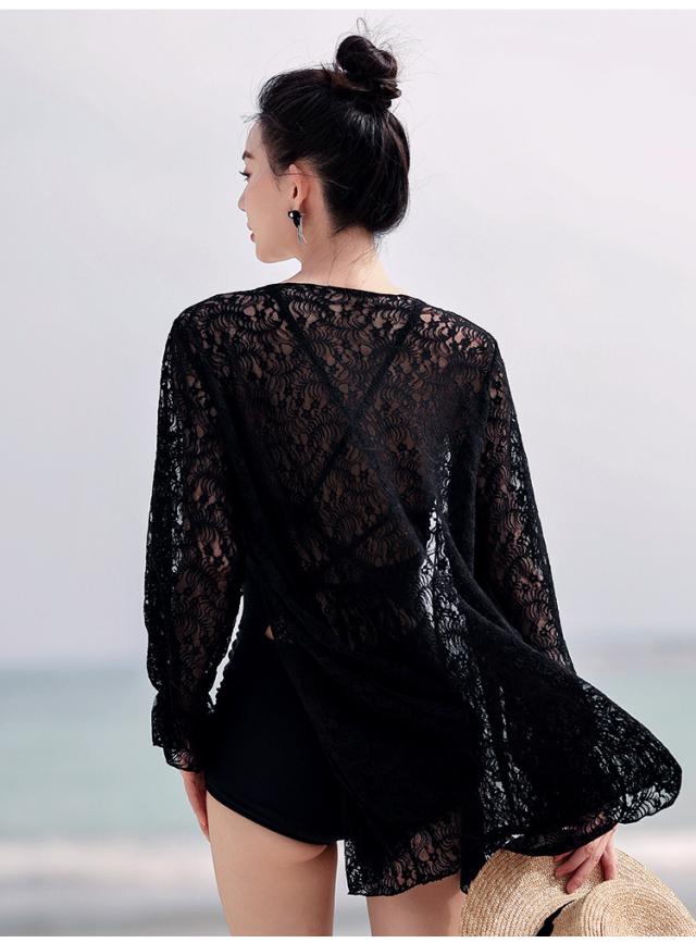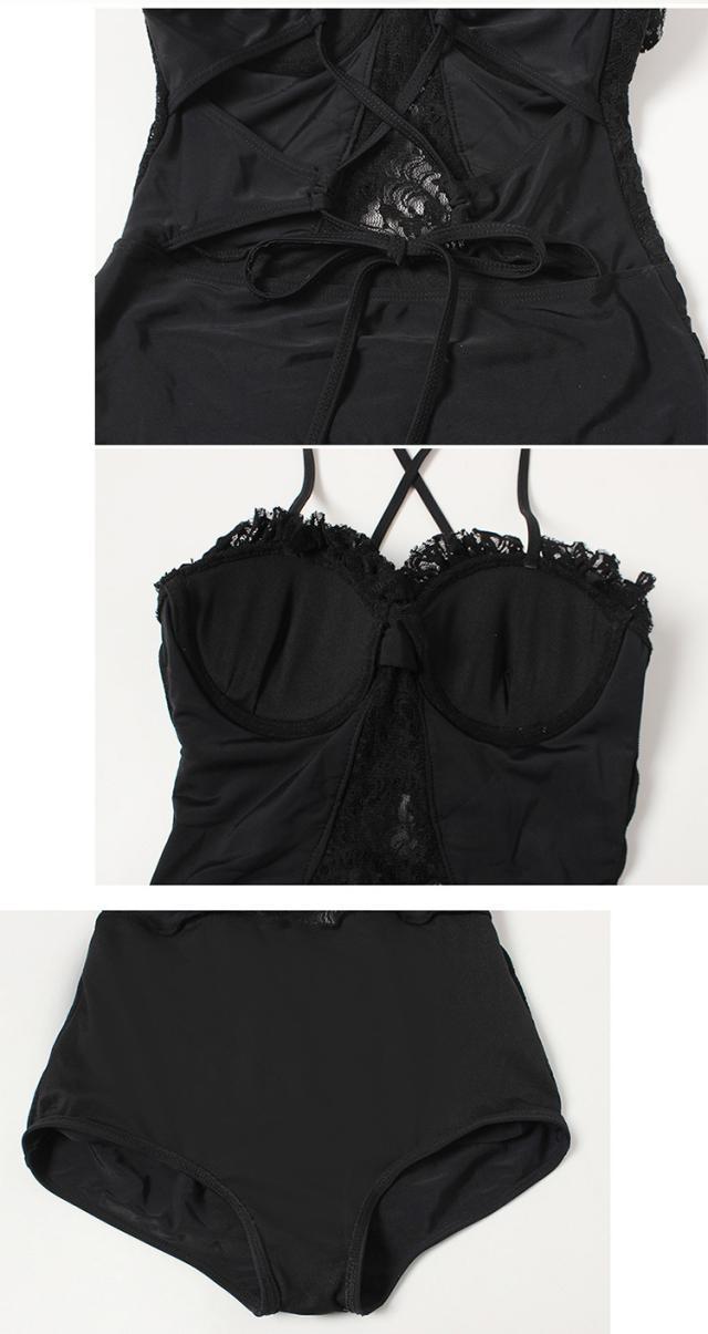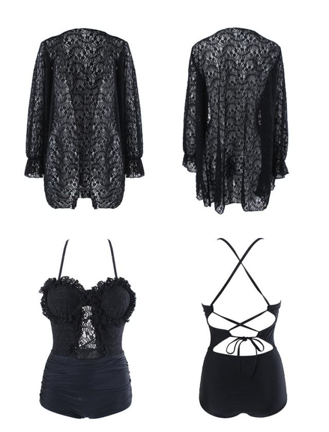 水着 スイムウエア レディース ワンピース 長袖ガウン 2点セット レース フリル バッククロス バックシャン セクシー sexy 大人可愛い きれいめ おしゃれ お洒落 シンプル 大人 大人っぽい 主役級 存在感 クール ゴージャス 華やか 女っぽ 体型カバー M L XL ブラック 黒