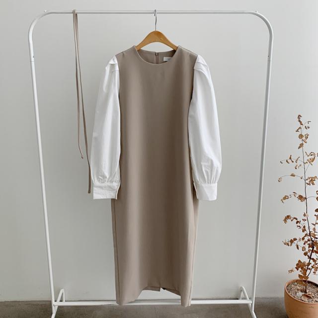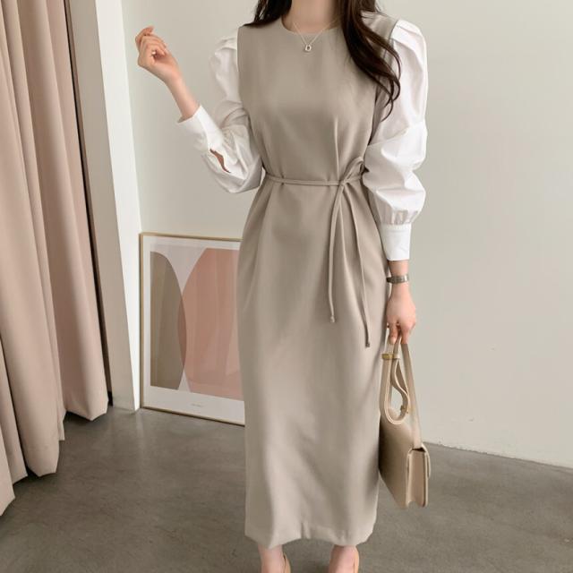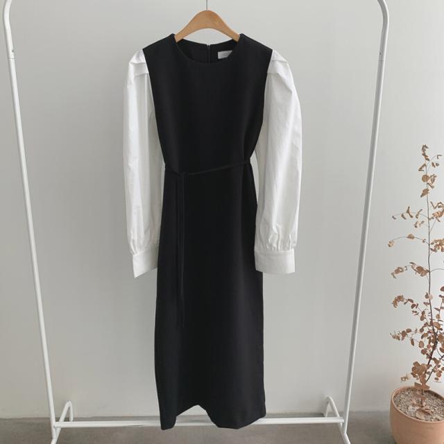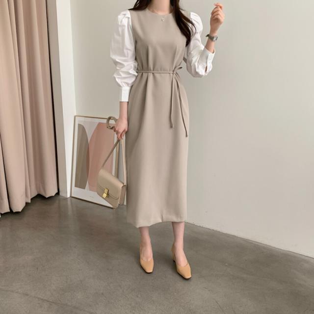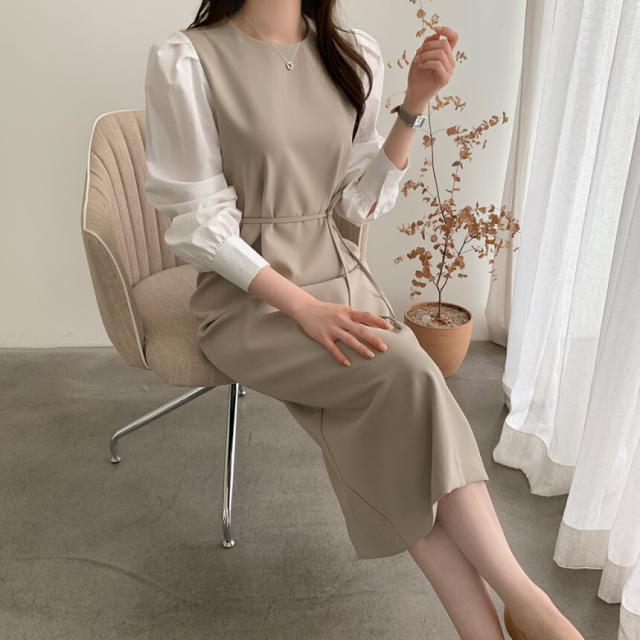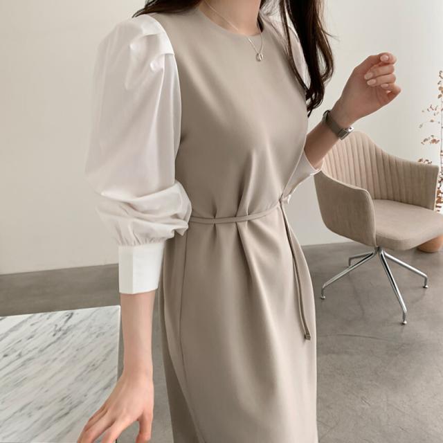 ワンピース レディース ジャンパースカート風 ペンシルスカート ナロースカート 切り替えデザイン ドッキング ミモレ丈 ロング丈 長袖 ウエストリボン ラウンドネック パフスリーブ 大人可愛い きれいめ シンプル 大人 上品 おしゃれ お洒落 かっこいい 大人女子 こなれ感 抜け感 エレガント フェミニン 存在感 フリーサイズ ワンサイズ 無地 ベージュ ブラック 春 秋 10代 20代 30代 40代 50代 60代 ママ オフィス ビジネス OL 通勤 学生 通学 デート お出かけ 女子会 旅行