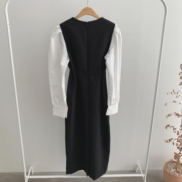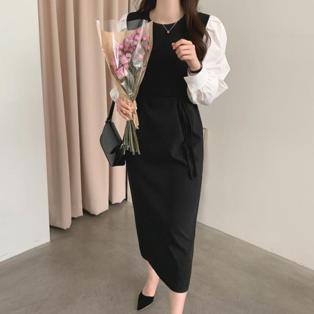 ワンピース レディース ジャンパースカート風 ペンシルスカート ナロースカート 切り替えデザイン ドッキング ミモレ丈 ロング丈 長袖 ウエストリボン ラウンドネック パフスリーブ 大人可愛い きれいめ シンプル 大人 上品 おしゃれ お洒落 かっこいい 大人女子 こなれ感