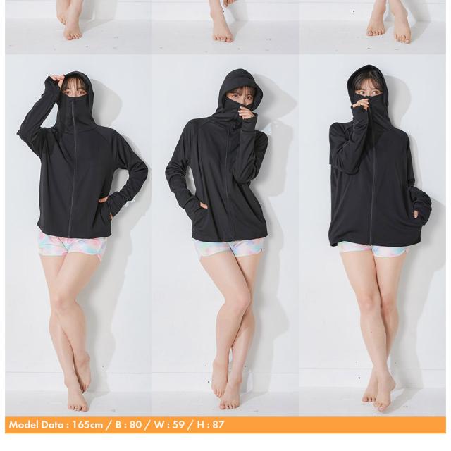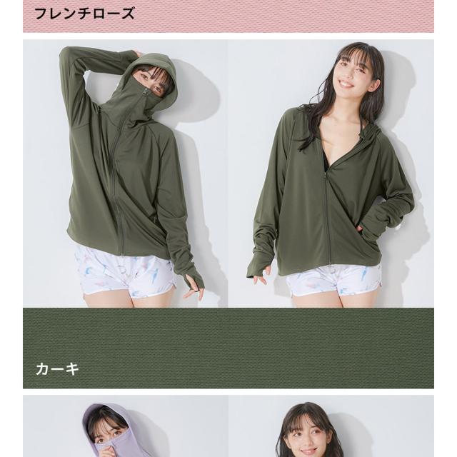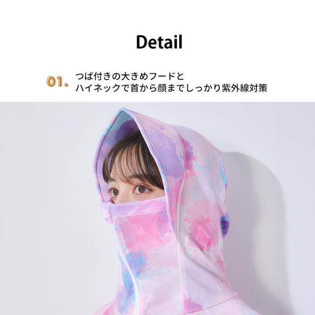 柔軟性のあるつば付きフードと目の下まで隠れるハイネックで、顔周りの紫外線対策もバッチリ。