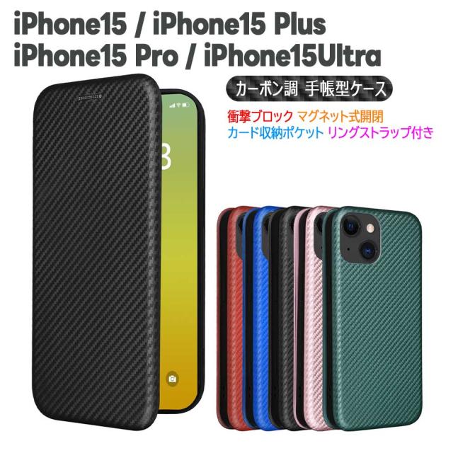 iPhone15 手帳型 薄型 カーボンデザイン 炭素繊維カバー TPU 保護バンパー 財布型 マグネット式 カード収納 落下防止 15 Pro Plus Ultra 送料無料