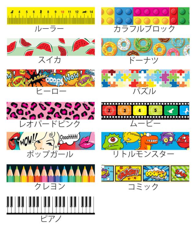 | 種類 | ルーラー、カラフルブロック、スイカ、ドーナツ、ヒーロー、パズル、レオパードピンク、ムービー、ポップガール、リトルモンスター、クレヨン、コミック、ピアノ |
