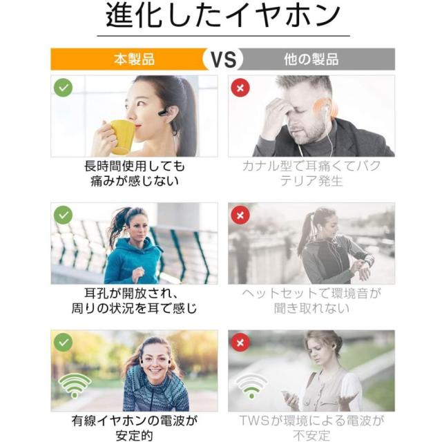 - 商品画像の状態をキープ出来ません。 耳から離れるベクトルが常に働き、とても外れやすいです。 装着時以外は本体(?)部分が左右重なります。 最大音量はかなり大きく、そこだけは気に入りました。 当然ですが骨伝導スピーカーではありません。 追記、購入から1ヶ月後左右の音声が入れ替わっていることに気付きました。不良品です。 販売店に連絡しましたが"初期不良対応は7日以内のみ"との事で交換して貰えませんでした。