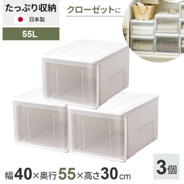 収納ケース たっぷり収納ケース 幅40×奥行55×高さ30cm ホワイト 3個セット 55L | クローゼット 押し入れ 押入れ 引き出し ウォークインクローゼット 収納ボックス 衣装ケース 積み重ね 衣類 服 入れ プラスチック プラケース