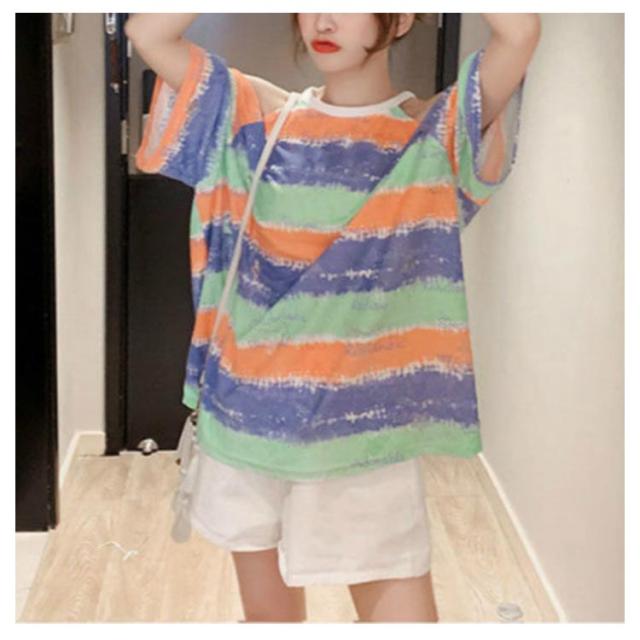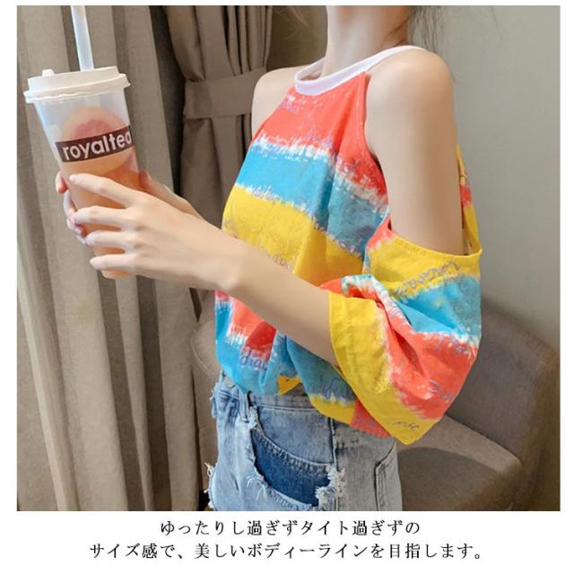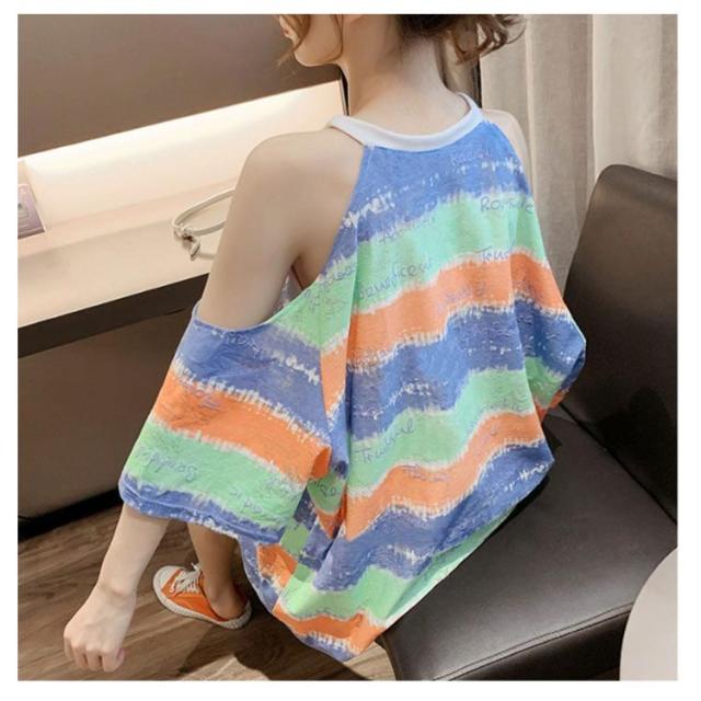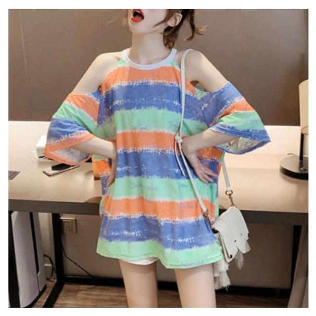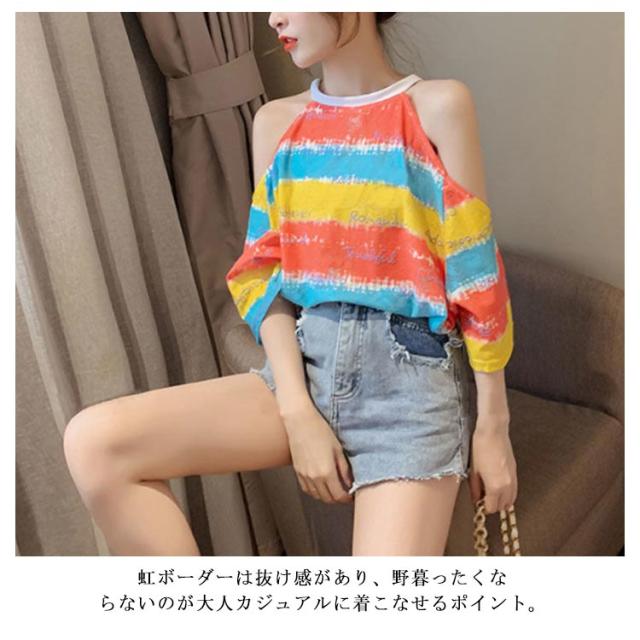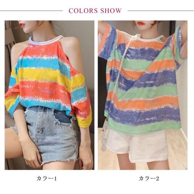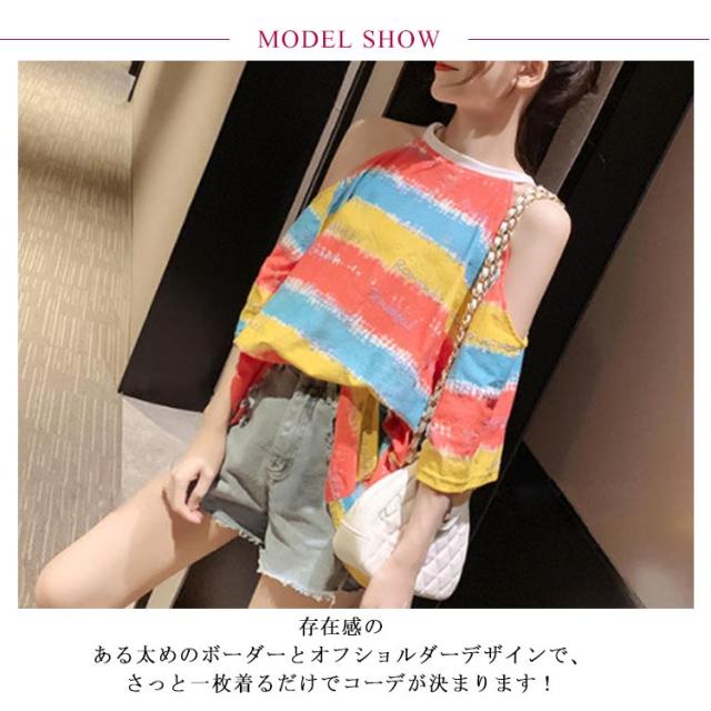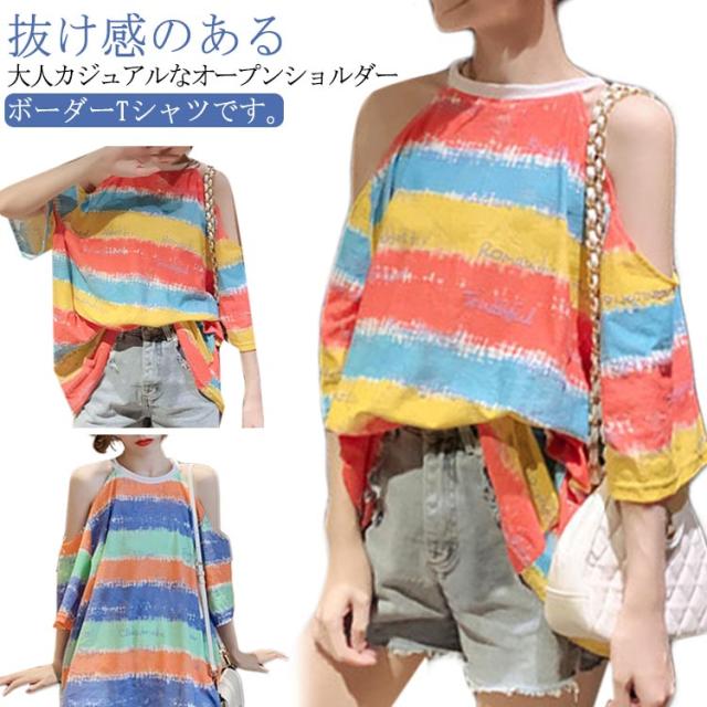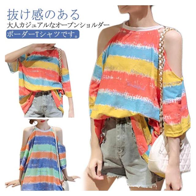 オフショルダー 肩だし 肌見せ 半袖Tシャツ Tシャツ チュニック 虹柄 カラフル ボーダー ゆるtシャツ 肩開き オフショル 半袖 夏 送料無料 大きめ 体型カバー 肌見せ ビッグTシャツ カットソー オーバーサイズ