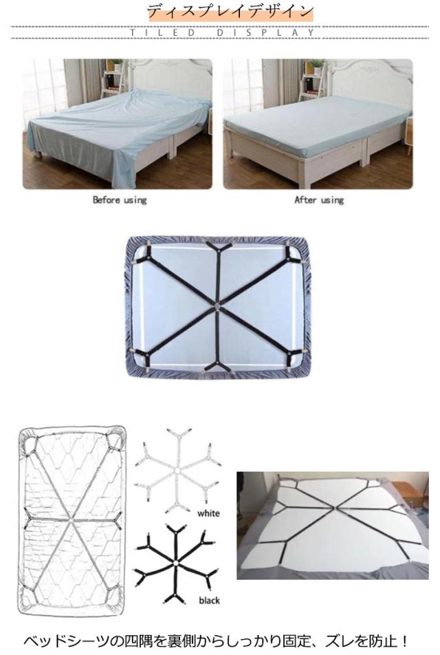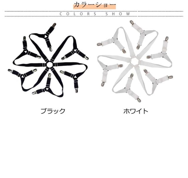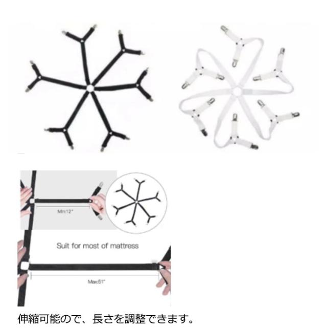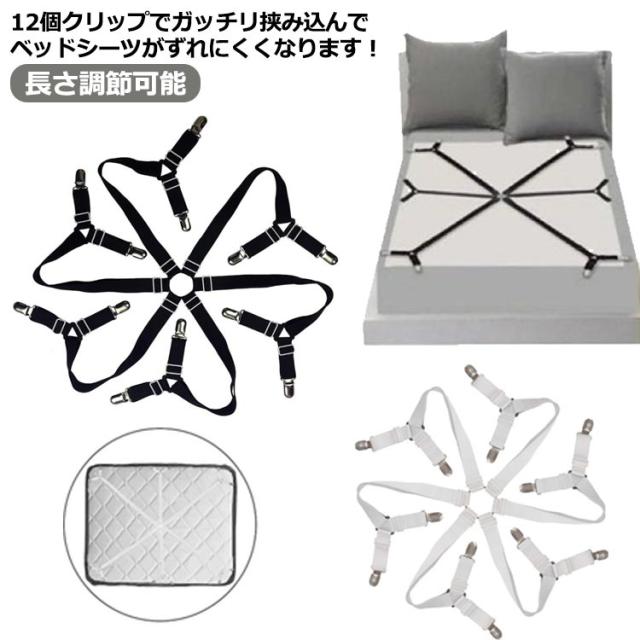 | 12個クリップでガッチリ挟み込んでベッドシーツがずれにくくなります! ベッドシーツの四隅を裏側からしっかり固定、ズレを防止! 伸縮可能ので、長さを調整できます。 布団ずれ防止、フラットシーツ、敷パッド、サスペンダー、ベッドカバ、マットレスカバー、ソファーカバなどの端をクリップで挟むことで、シーツがズレないようになります。 | |
