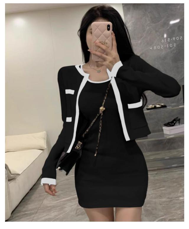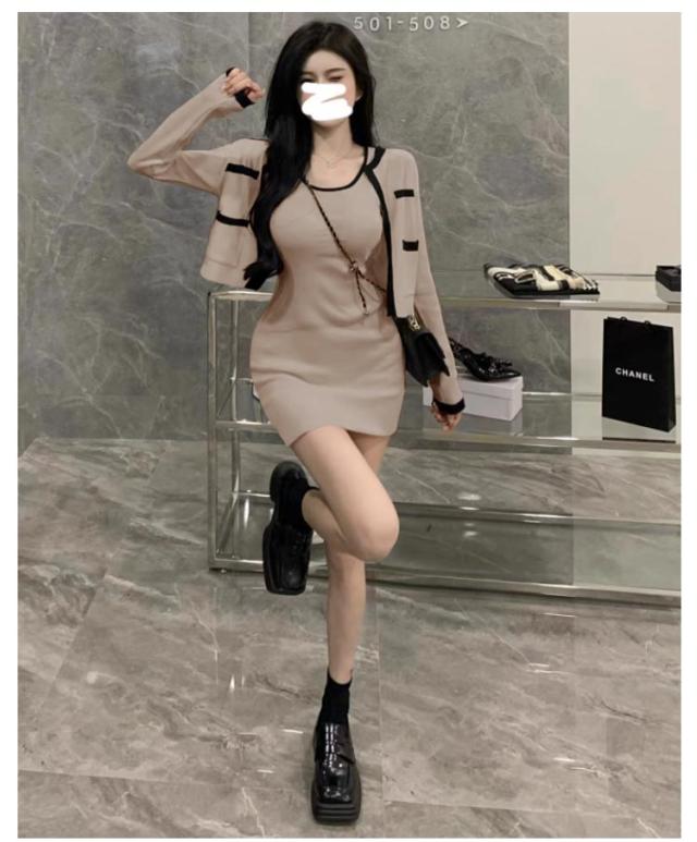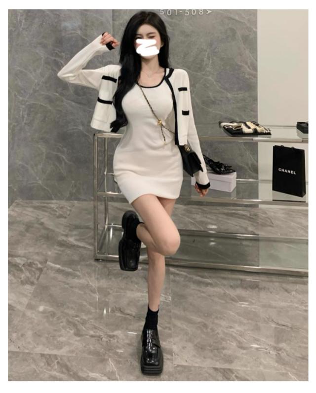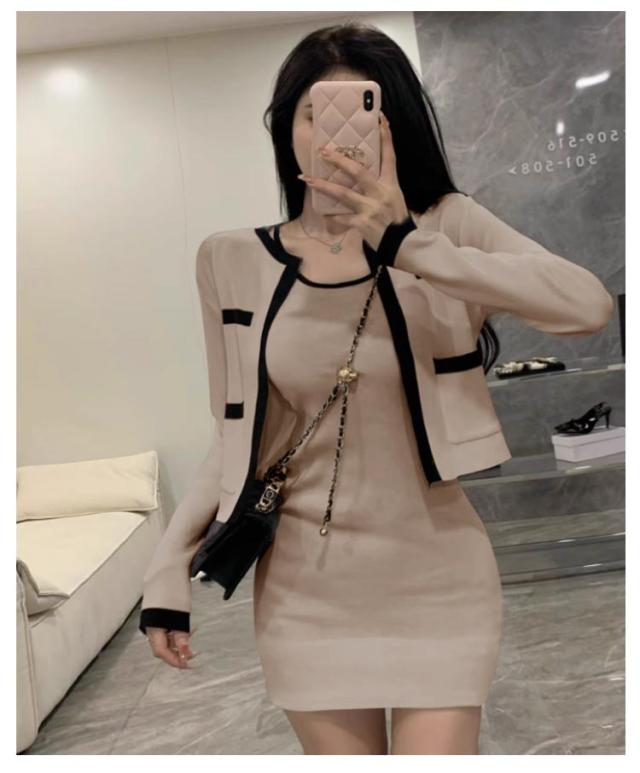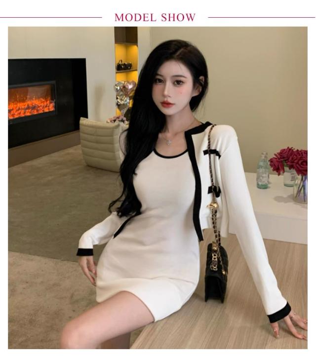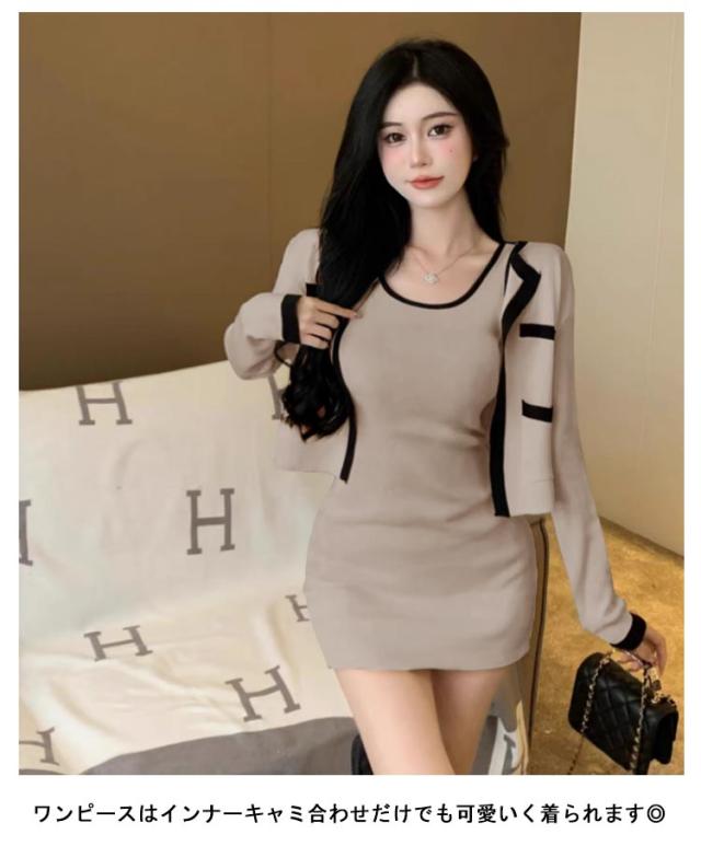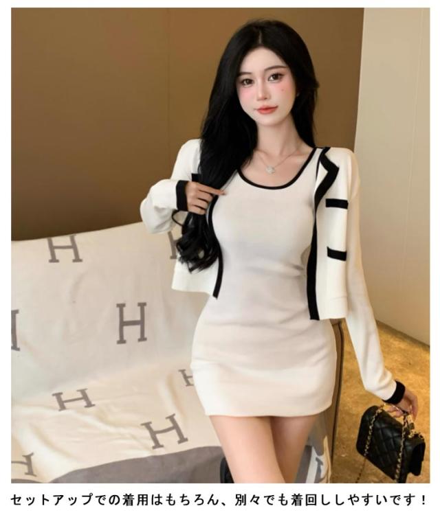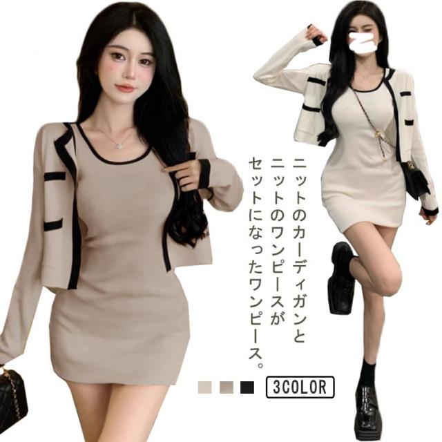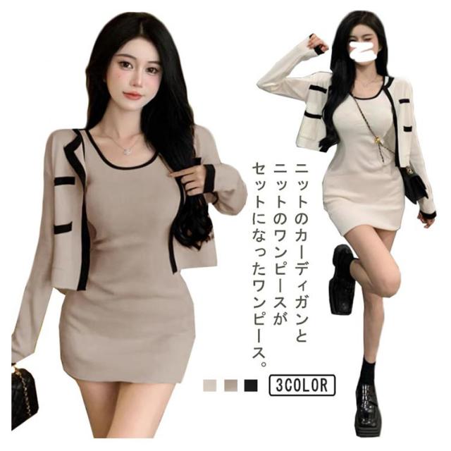 2点セット ニットカーディガン+ミニワンピース 配色 セットアップ 韓国 春夏 長袖カーディガン キャミソールワンピース ニットワンピース タイトワンピース 姫系ワンピース エレガント 可愛い 美脚 お呼ばれ