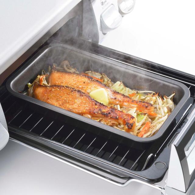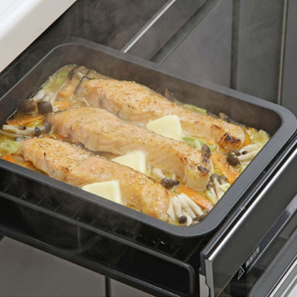 グリルは予熱時間がないから時短調理ができます。深型形状でグラタン皿としても使用でき、煮込み料理などにも使用できる便利なトレーはキッチンで幅広く重宝します。