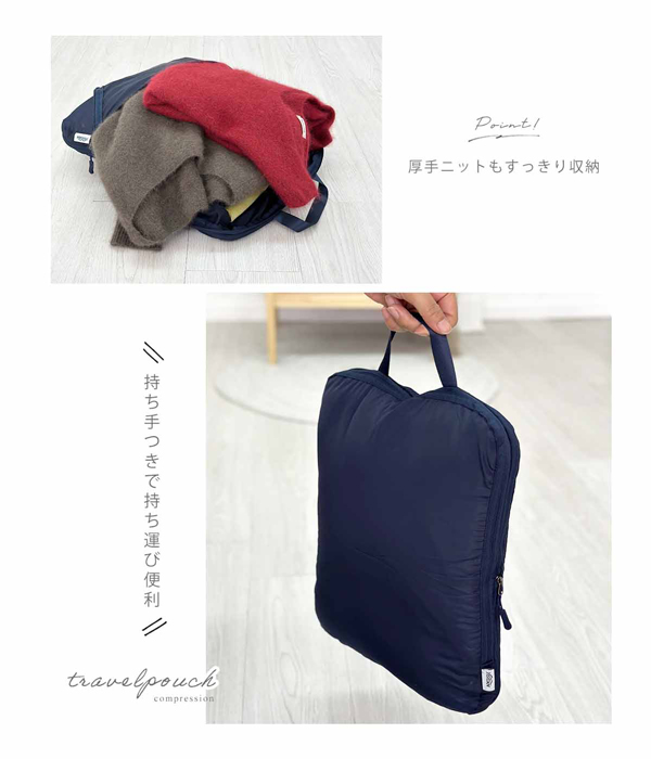 - 冬場のふわふわの衣類なら圧縮できるのかもしれないけれど、夏場の衣類に対しては単なる整理袋と同じ。 衣類を圧縮して旅行用の荷物を嵩張らせたくないなら、ビニール製で空気を除くタイプを使用したほうが良い。