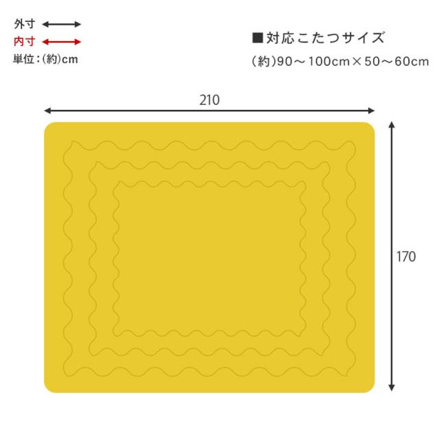 掛けふとん : 幅 210cm x 奥行 170cm対応こたつサイズ : 幅 90cm 〜 100cm x 奥行 50cm 〜 60cm