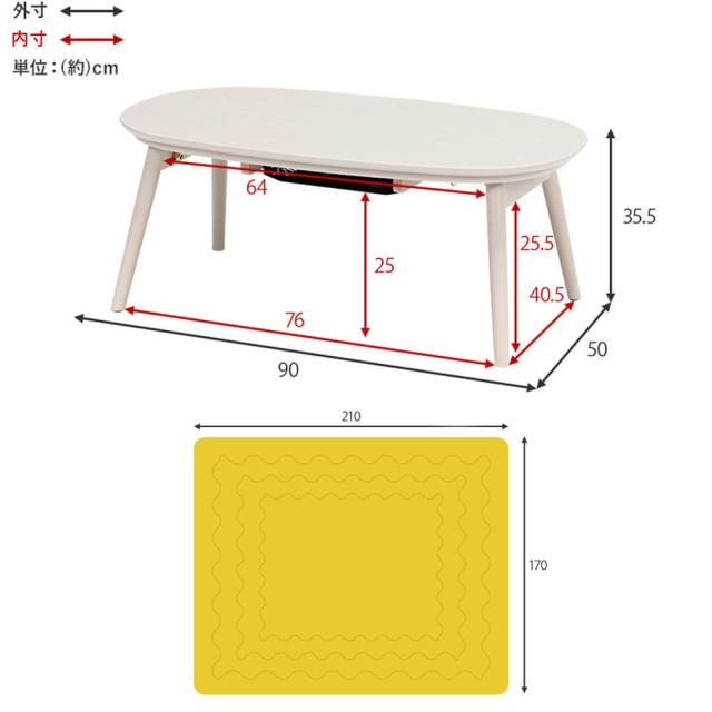 コタツ本体 : 幅 90cm x 奥行 50cm x 高さ35.5cm掛けふとん : 幅 210cm x 奥行 170cm