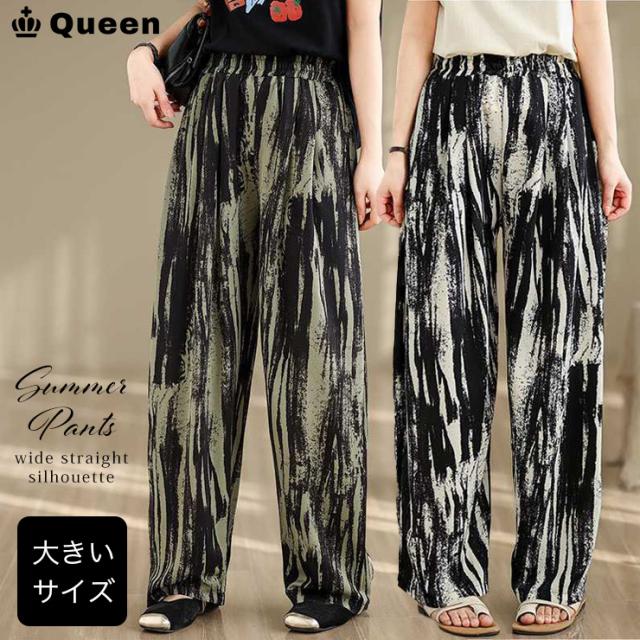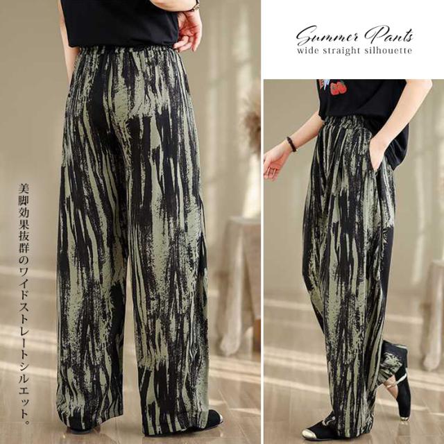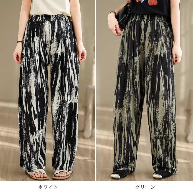 ★☆大きいサイズ レディース ワイドパンツ ニュアンス柄 ウエストゴム リラックスパンツ 夏 L LL 3L 4L 5L ホワイト グリーン☆★