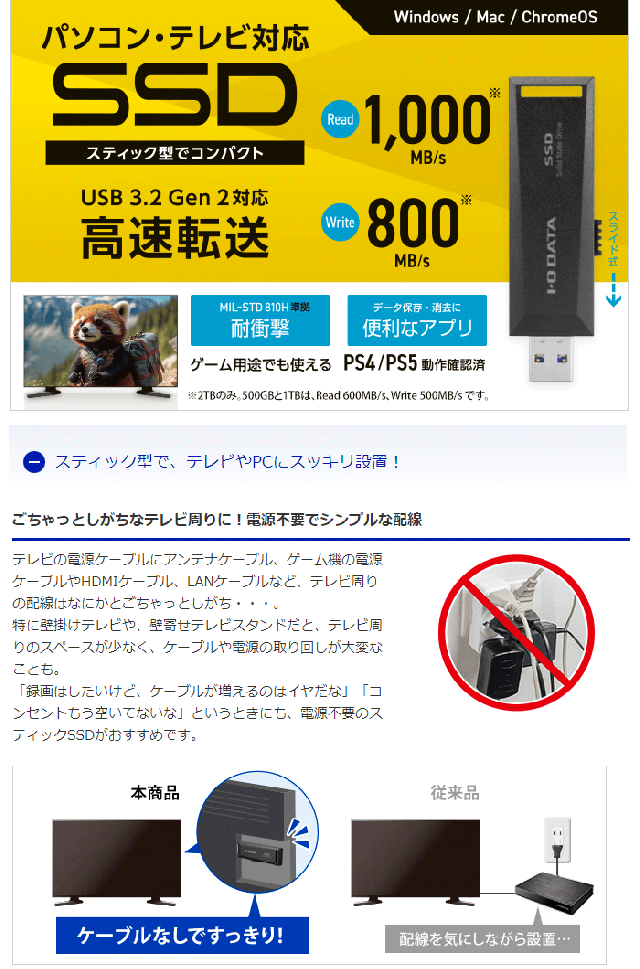 本商品はUSB 3.2 Gen 2対応のスティックSSDです。USBメモリーのような小ささにも関わらずTV録画や高速データ転送が可能!スティックタイプでTV背面にもスッキリ設置でき、壁掛け/壁寄せTVにオススメです。そのほか、ゲーム機(PS5)など、さまざまな機器でもご使用いただけます。