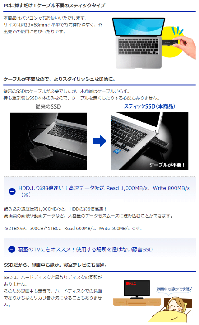 SSPMUS500K USB 3.2 Gen 2対応。パソコンのデータ保存&テレビ録画に対応!コンパクトなスティックSSD。読み込み速度は最大600MB/s