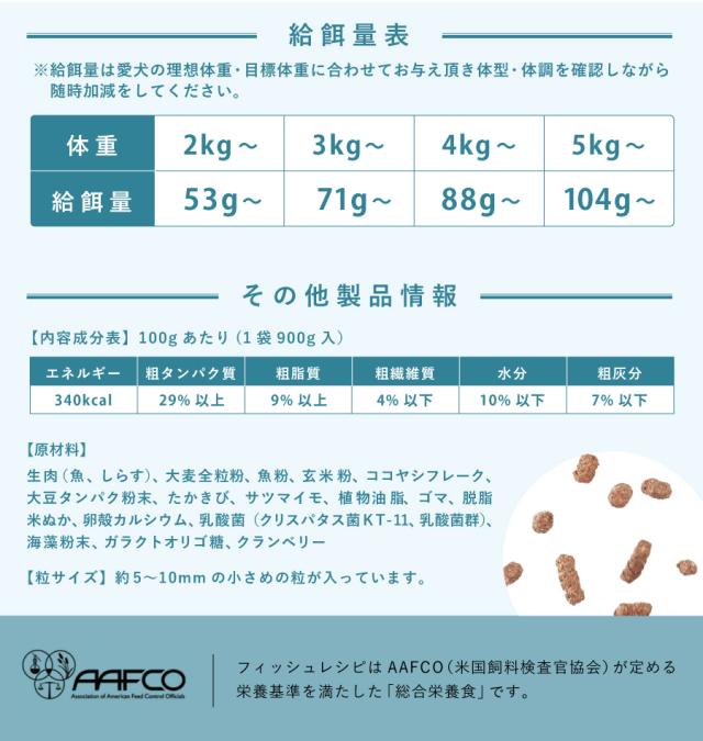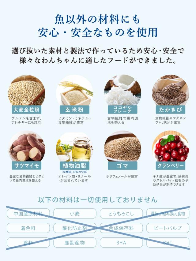【原材料】:生肉(魚、しらす)、大麦全粒粉、魚粉、玄米粉、ココヤシフレーク、大豆タンパク粉末、たかきび、サツマイモ、食用植物油脂、ゴマ、脱脂米ぬか、卵殻カルシウム、乳酸菌(クリスパタス菌KT-11、乳酸菌群)、海藻粉末、ガラクトオリゴ糖、クランベリー