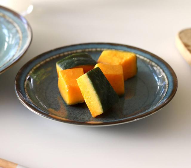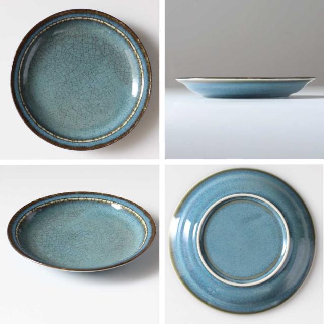 艶のある釉薬を使用し、つるつるとした質感です。リム部分にはデザインがほどこされ、盛り付けたお料理を引き立てます。見込み部分の複雑に入った模様はひとつひとつ表情が異なり、いつもの何気ないお料理も特別に感じさせてくれそうです。