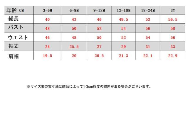 | サイズについての説明 | 年齢 総長 バスト ウエスト 袖丈 肩幅 ※サイズ表の実寸法は商品によって1-3cm程度の誤差がある場合がございます。 |