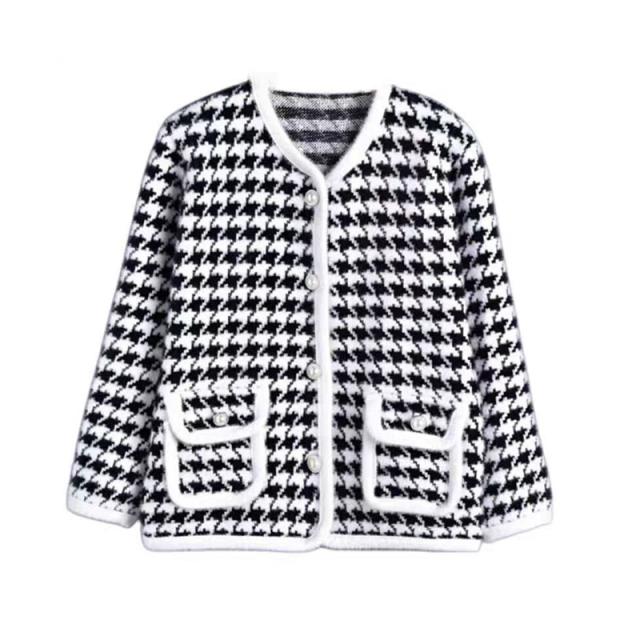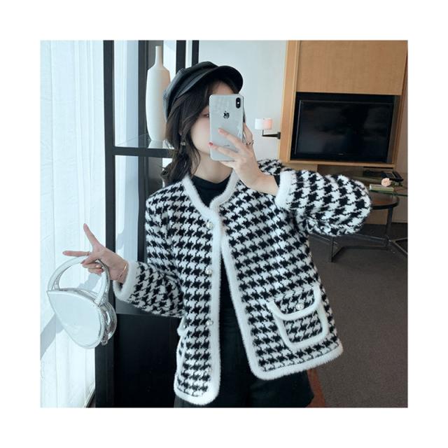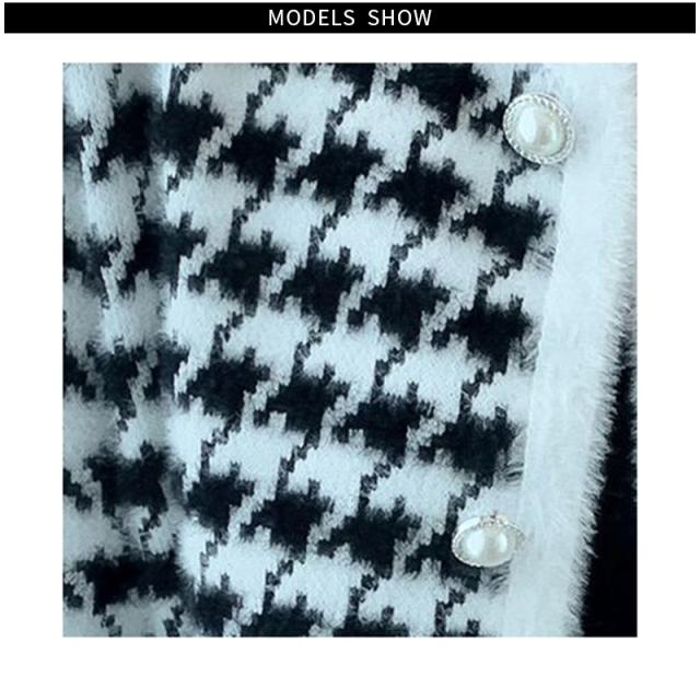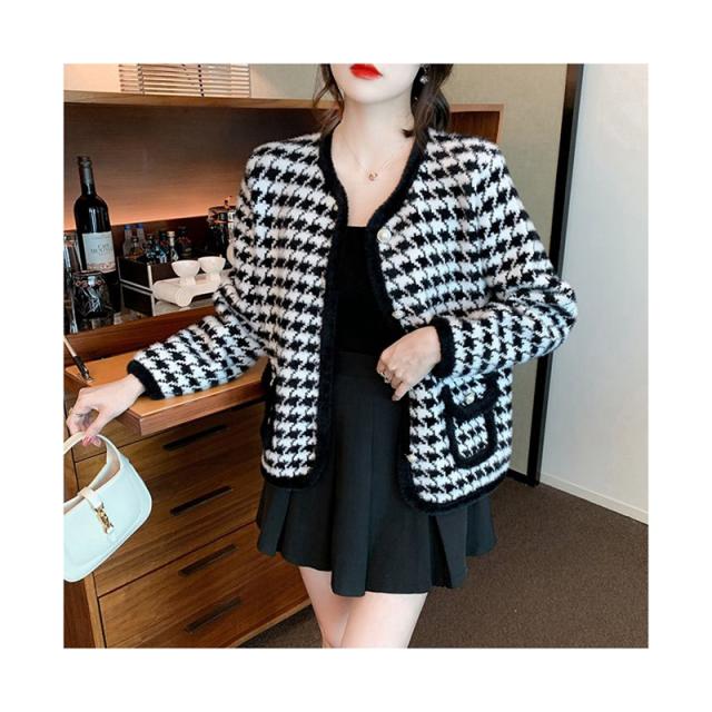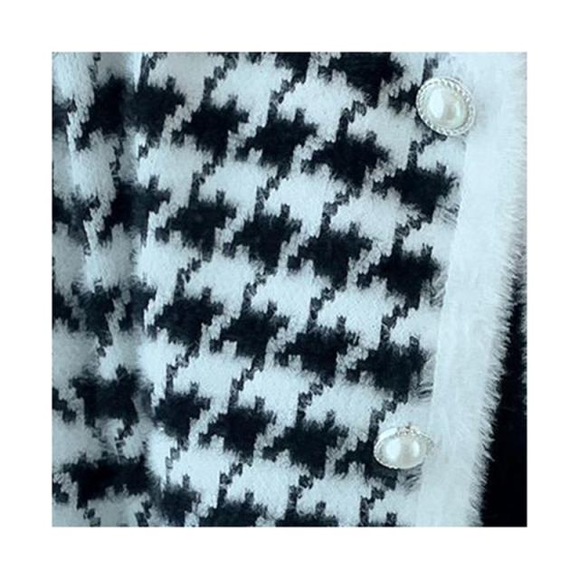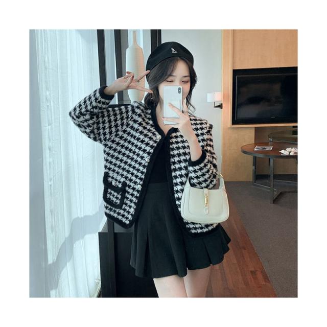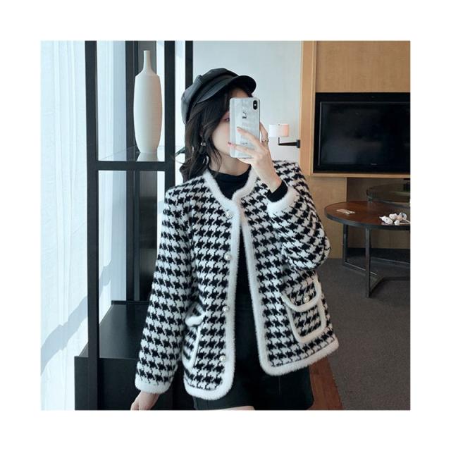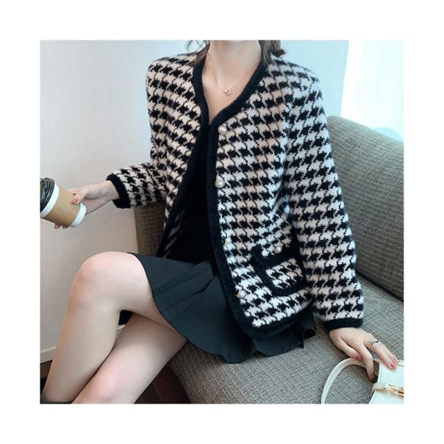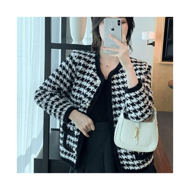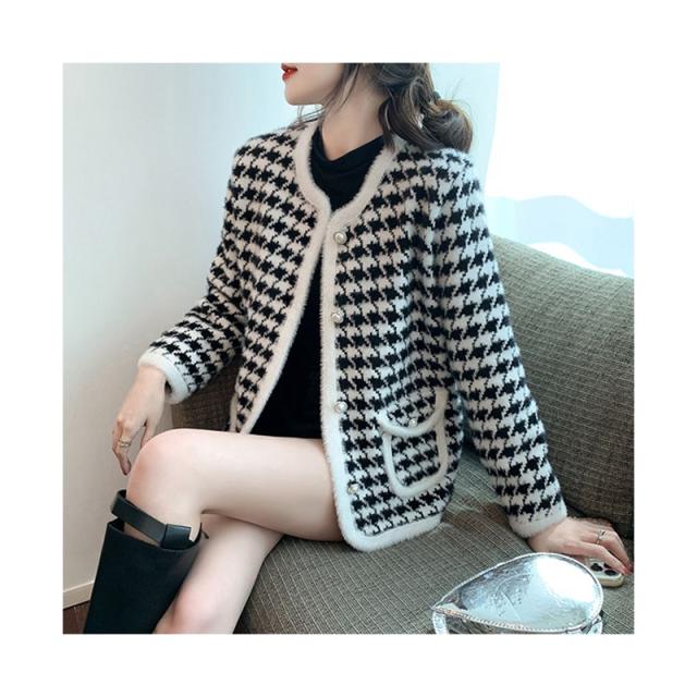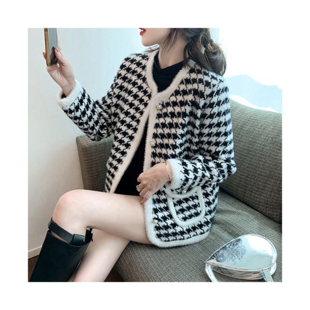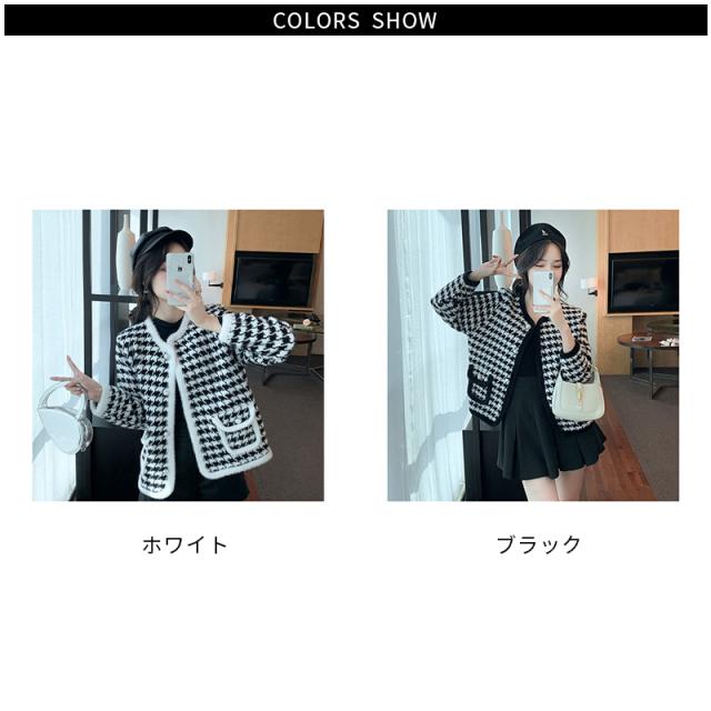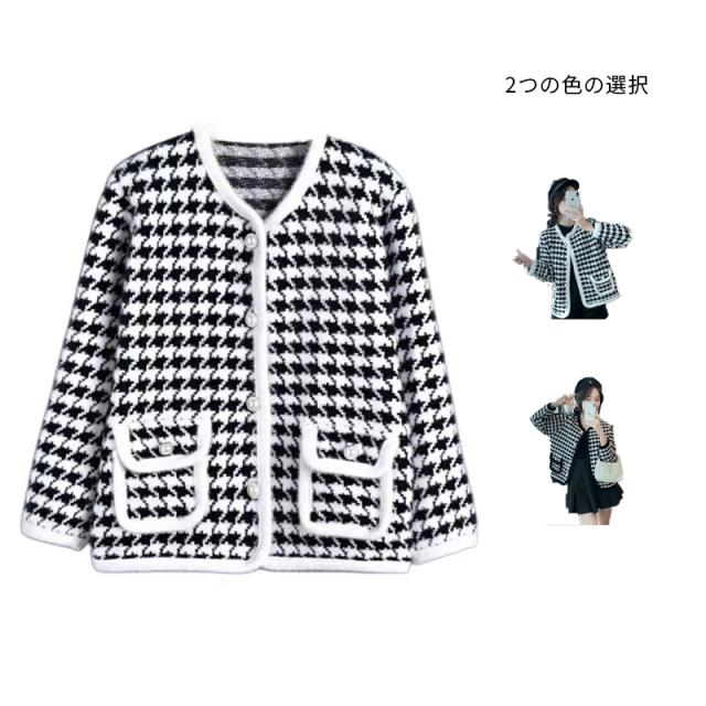 送料無料 レディース ゆったり ジャケット 長袖 ニットカーディガン 40代 アウター ニットコーディガン オシャレ 千鳥格子ノーカラージャケット 秋服 韓国風 20代 30代 フェイクミンクカーディガン