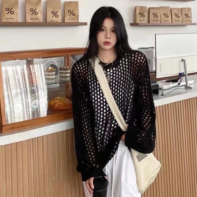 メッシュニット サマーニット 透かし編み 肌見せ 長袖 トップス 重ね着 レイヤード あみあみ 透け フィッシュネット かぎ針編み 編みニット プルオーバー 重ね着 レイヤード