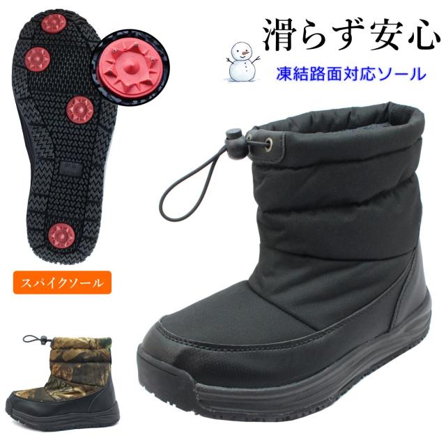 スノーブーツ レデイース スパイク ソール 防水 防滑 防暖 軽量 AS 7905 ショート丈 ウインター シューズ 靴 ブラック カモ