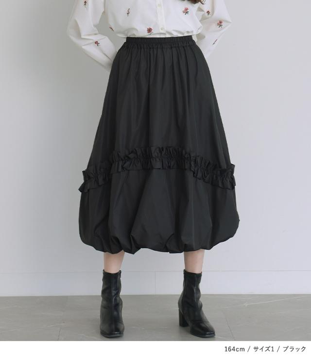 『フリルバルーンスカート』【メール便不可】【30】[ロングスカート ボトムス レディース 春秋冬 ミモレ丈 バルーン コクーン ボリューム感 無地 ウエストゴム 裏地付き マット 光沢 シャカシャカ 裾ゴム]