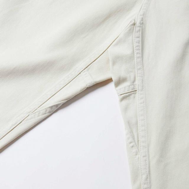 パンツ左右についた大きなポケット、後身頃のパッチポケットが特徴です。耐久性が高く、ハリコシのある、激しい動きにも耐えるオーガニックコットン使用のコットンツイルを使用し、雰囲気のある表情に染め上げています。 |