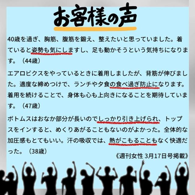 <鍛えるタイプ> 歩いていつでもエクササイズ!体を鍛えよう! 鍛えるタイプは、エクササイズ時だけでなく 日常から身体をサポートします。 ▽60年緩女性を応援してきた「週刊女性」と 100年以上身体に寄り添ってきた「D&M」の共同開発商品。 いつまでも笑顔で元気でいたい女性に。 女性に寄り添った機能性インナーウェア。 |