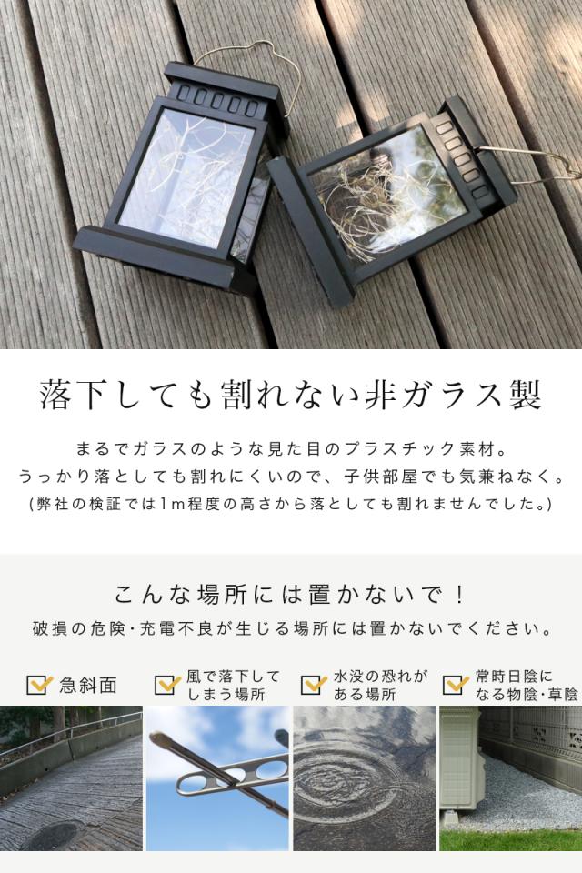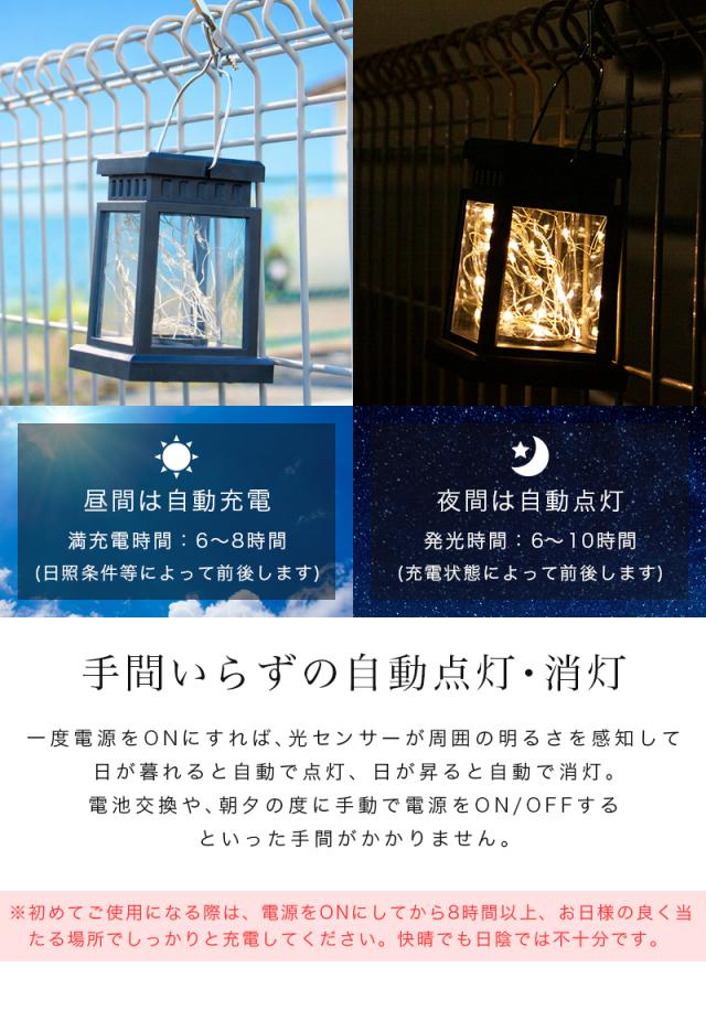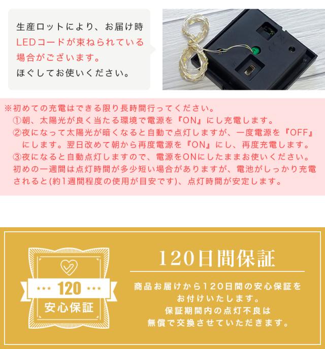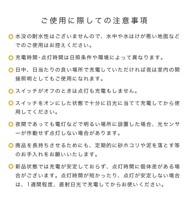 ※水没の耐水性はございませんので、水中や水はけが悪い地面などでのご使用はお控えください。 ※充電時間・点灯時間は日照条件や環境によって異なります。 ※日中、日当たりの良い場所で充電していただければ夜は室内の間接照明としてもご使用になれます。 ※スイッチがオフのときは点灯も充電もしません。 ※スイッチをオンにした状態で十分に日光に当てて充電してから使用してください。 ※夜間であっても電灯などで明るい場所に設置した場合、光センサーが作動せず点灯しない場合があります。 ※商品を長持ちさせるためにも、定期的に砂ホコリや泥を落とす等のお手入れをお願いいたします。 ※新品状態では充電が安定しておらず、点灯時間に個体差がある場合がございます。点灯時間が短かったり、点灯が安定しない場合は、1週間程度、直射日光で充電してからお使いください。 |