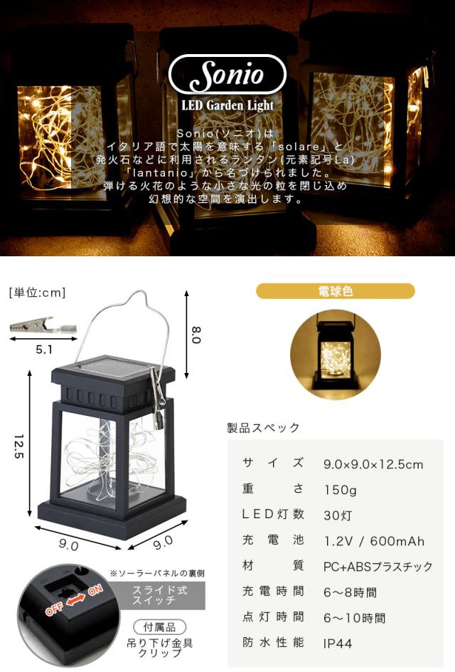 ------------------------------------------------------------- Sonio(ソニオ)はイタリア語で太陽を意味する「solare」と 発火石などに利用されるランタン(元素記号La) 「lantanio」から名づけられました。 弾ける火花のような小さな光の粒を閉じ込め幻想的な空間を演出します。 ------------------------------------------------------------ 【1t 電球色】 〇製品スペック 〇サイズ 9.0×9.0×12.5cm 〇重さ 150g 〇LED灯数 30灯 〇充電池 1.2V/600mAh 〇材質 PC+ABSプラスチック 〇充電時間 6〜8時間 〇点灯時間 6〜10時間 〇防水性能 IP44 〇付属品 吊り下げ金具クリップ ※初めての充電はできる限り長時間行ってください。 1.朝、太陽光が良く当たる環境で電源を『ON』にし充電します。 2.夜になって太陽光が暗くなると自動で点灯しますが、一度電源を『OFF』 にします。翌日改めて朝から再度電源を『ON』にし、再度充電します。 3.夜になると自動点灯しますので、電源をONにしたままお使いください。 初めの一週間は点灯時間が多少短い場合がありますが、電池がしっかり充電 されると(約1週間程度の使用が目安です)、点灯時間が安定します。 ・電気代0円! ・太陽光で発電×充電 ・工事不要!吊るすだけで設置完了 ・置き型インテリアとしても◎ ・エコなソーラー充電式 ・昼間は自動充電 ・夜間は自動点灯 ・手間いらずの自動点灯、消灯 ・小雨も安心の防滴仕様 ・濡れてもサビない素材 ・IP44の防塵 ・防水設計 ・熱くならないので触れても安全 ・落下しても割れない非ガラス製 |