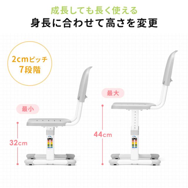 ●高さ調節できる子ども向けのイスです。●イスの高さは座面を32〜44cmの間で2cmピッチ7段階で調整可能です。