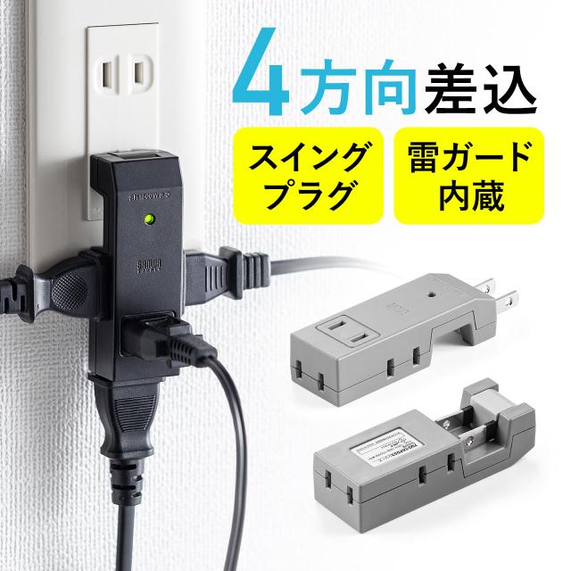 電源タップ 4個口 2P 小型 コンパクト 雷ガード スイングプラグ ブラック グレー[700-TAP052]