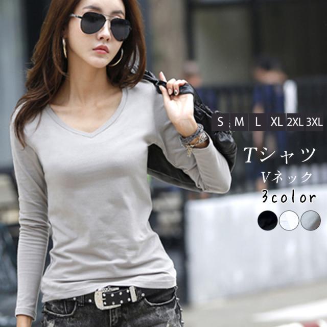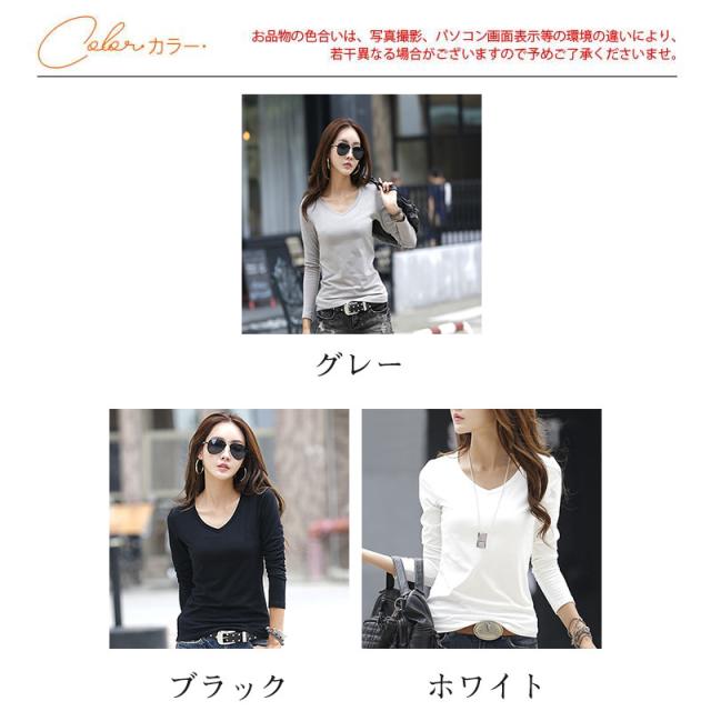 Tシャツ レディース 長袖 トップス カットソー 綿 ロンT インナー Vネック 無地 カジュアル 肌着 重ね着 レイヤード 着痩