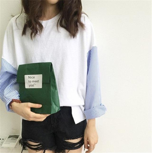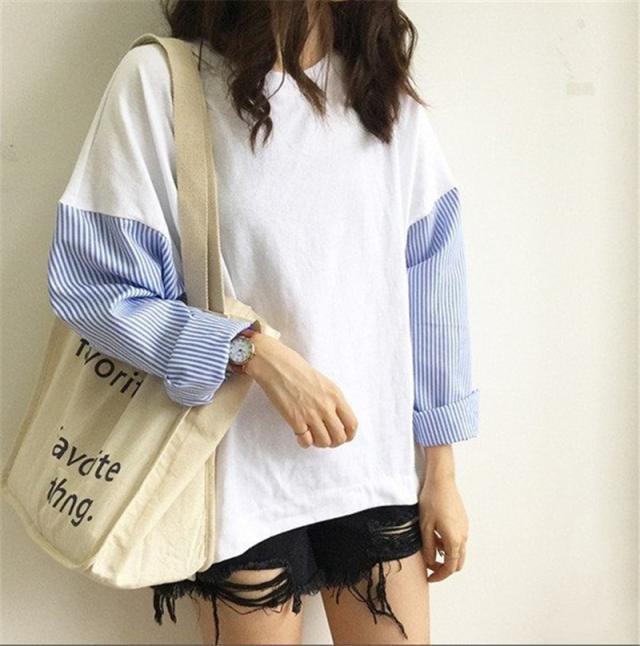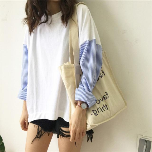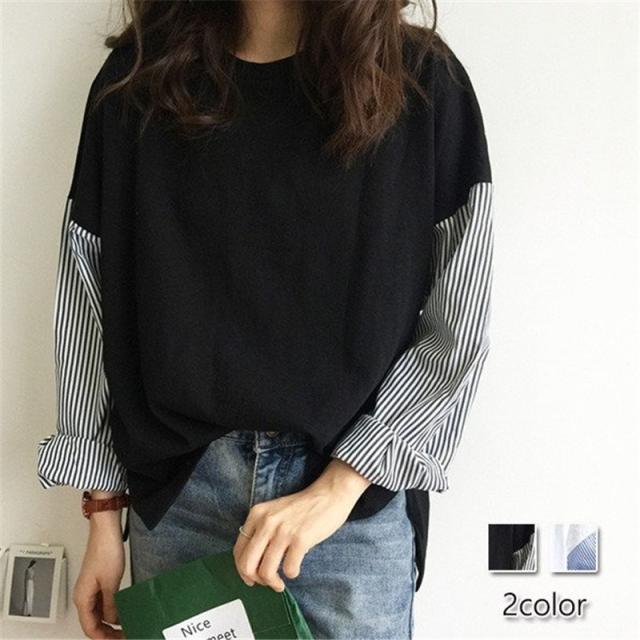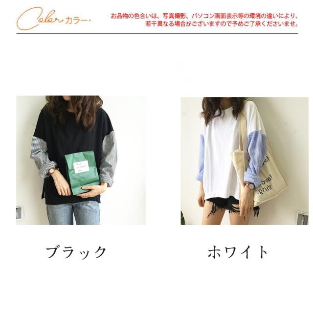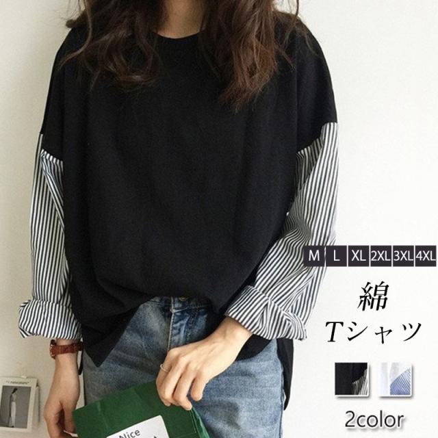 Tシャツ レディース 長袖 カットソー シャツ ブラウス 綿 切り替え ストライプ柄 クルーネック 大きいサイズ ゆったり スリッ
