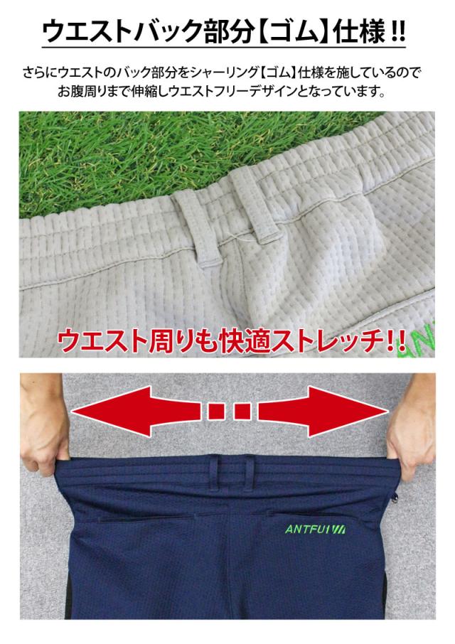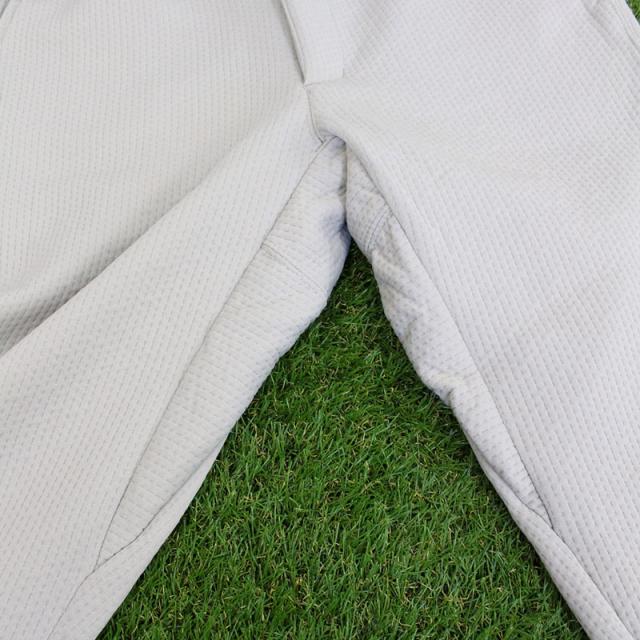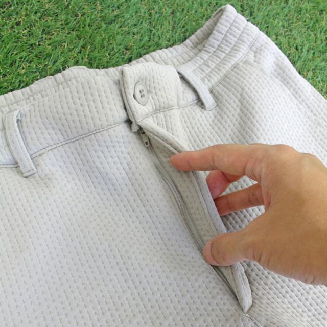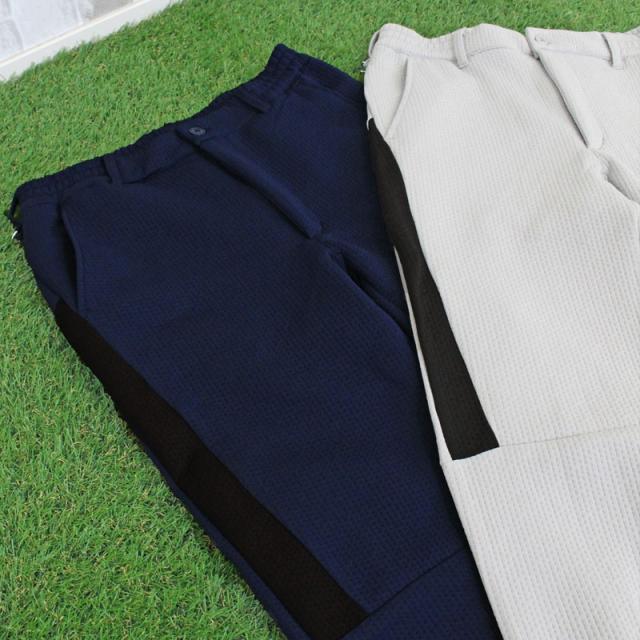 スポンジエンボス素材の伸縮性の高いストレッチゴルフパンツ。