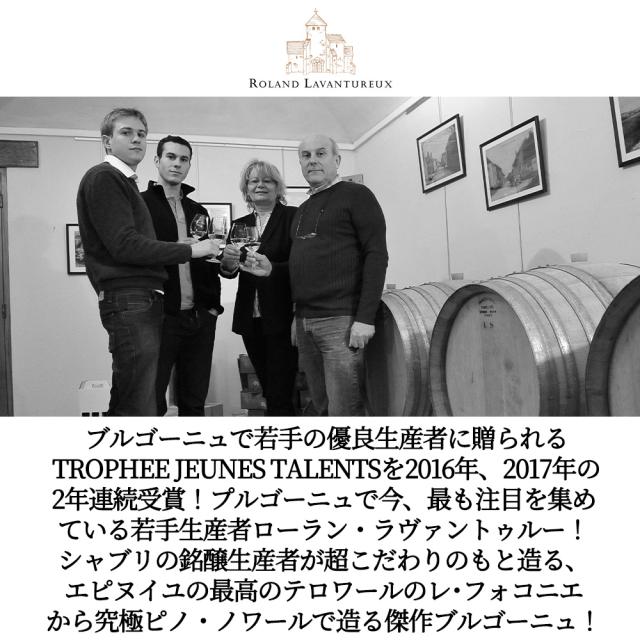 ブルゴーニュで若手の優良生産者に贈られるTROPHEE JEUNES TALENTSを2016年、2017年の2年連続受賞!プルゴーニュで今、最も注目を集めている若手生産者ローラン・ラヴァントゥルー!シャブリの銘醸生産者が超こだわりのもと造る、エピヌイユの最高のテロワールのレ・フォコニエから究極ピノ・ノワールで造る傑作ブルゴーニュ!