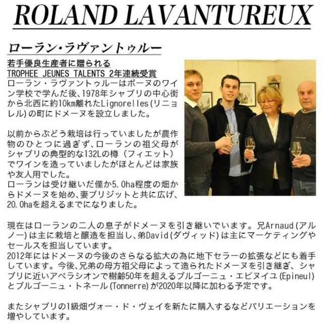 ローラン・ラヴァントゥルー氏がボーヌのワイン学校で学んだ後、1978年シャブリの中心街から北西に約10km離れたLignorelles(リニョレル)の街にドメーヌを設立!一族では以前からブドウ栽培を行っていましたが、農産物のひとつに過ぎず、ローランの祖父母も若干のシャブリを生産していましたが、生産されたワインのほとんどは家族や友人用の自家消費用でした!ローラン氏は受け継いだ5ha程の畑からドメーヌとしてはじめ、妻ブリジットさんと共に地道に広げていき、現在では20hを超えるまでに成長!今ではローラン氏の二人の息子がドメーヌを継承!