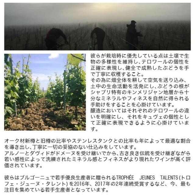 兄アルノー氏は主に栽培と醸造、弟ダヴィッド氏は主にマーケティングやセールスを担当!兄弟がドメーヌを受け継いでから、古き良き伝統を受け継ぎながらも、若い感性によって、洗練されたミネラル感とフィネスのあるワインが高く評価!ブルゴーニュで若手優良生産者に贈られるTROPHEE JEUNES TALENTS(トロフェ・ジューヌ・タレント)を2016年に次いで2017年も2年連続で受賞するなどシャブリのみならず、プルゴーニュで今、最も注目を集めている若手生産者!