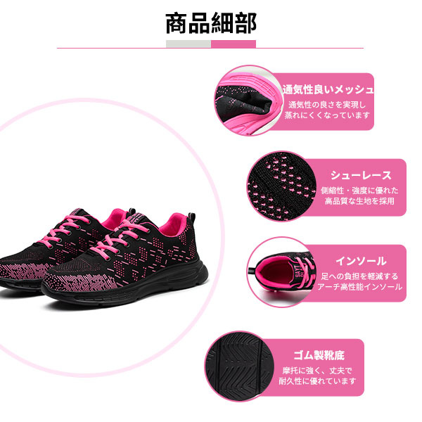 - 思っていたより少し大きめでしたが軽いので足が楽になりそうです。 靴ひもが画像で見るより明るめのピンク。履き口はクッション入っていて歩いても痛くないです。