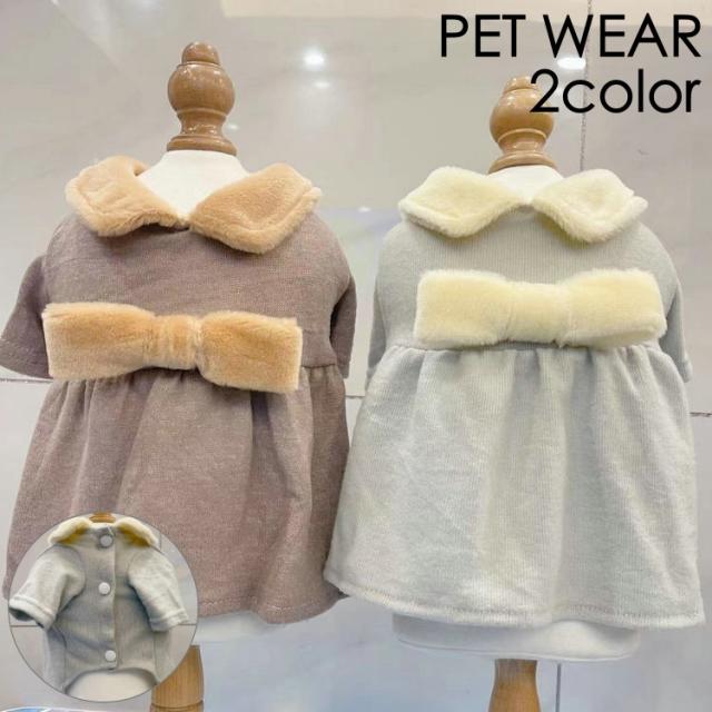 ペットウェア ワンピース 犬服 猫服 洋服 ドッグウェア キャットウェア 袖あり 襟付き もこもこ リボン 前ボタン 前開き 秋