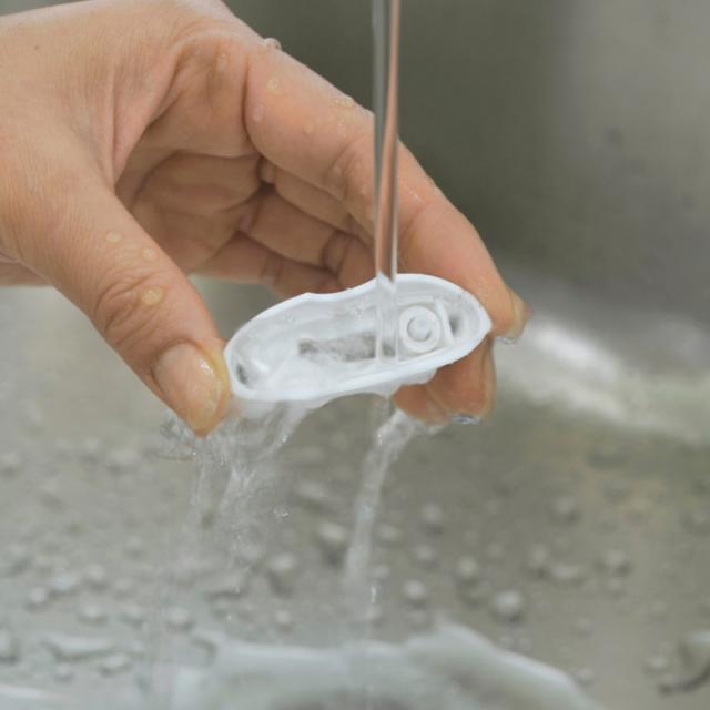 削った爪は容器内に入るので、ヘッドを取り外せば簡単に捨てられます。付属のお掃除ブラシでゴミをかき出します。また、ヘッド部分のみ、丸ごと水洗いができるので、清潔に保てます。