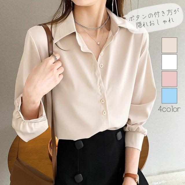 長袖シャツ シフォンシャツ レディース 女性 トップス スタンダードカラー 前ボタン 無地 単色 シンプル 着回し フォーマル