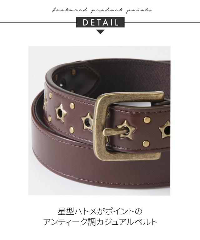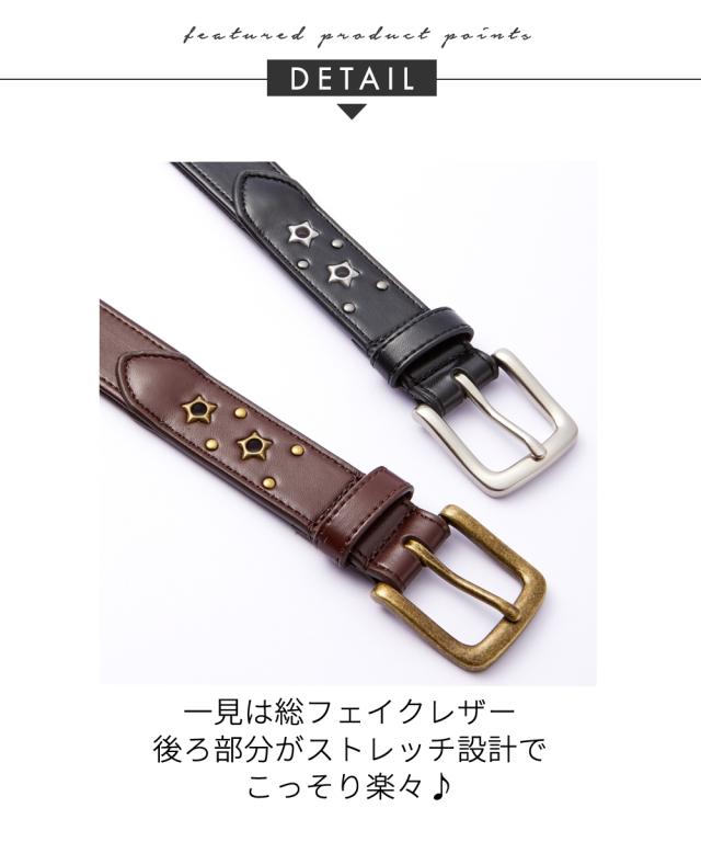 [keyword] 靴 レディースシューズ バッグ アクセサリー 大きいサイズ レディース 全長125cm〜 合成皮革 素材 無地 無地調 柄 かわいい おしゃれ カジュアル 定番 着回し レジャー アウトドア向け 屋外 キャンプ 秋 [comment] nissenオリジナル!アンティーク調の星型ハトメがポイントのストレッチカジュアルベルトです。 ■ポイント ・ストレッチフェイクレザーでラクしておしゃれ。 ・アンティーク調星形ハトメ。 ・ベルトの切替から後ろ部分がストレッチになっており、しゃがみ姿勢