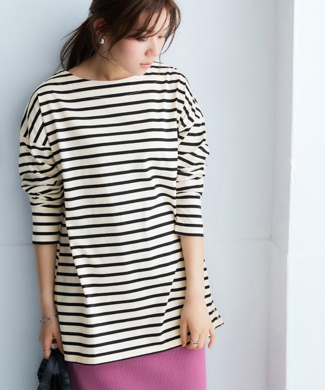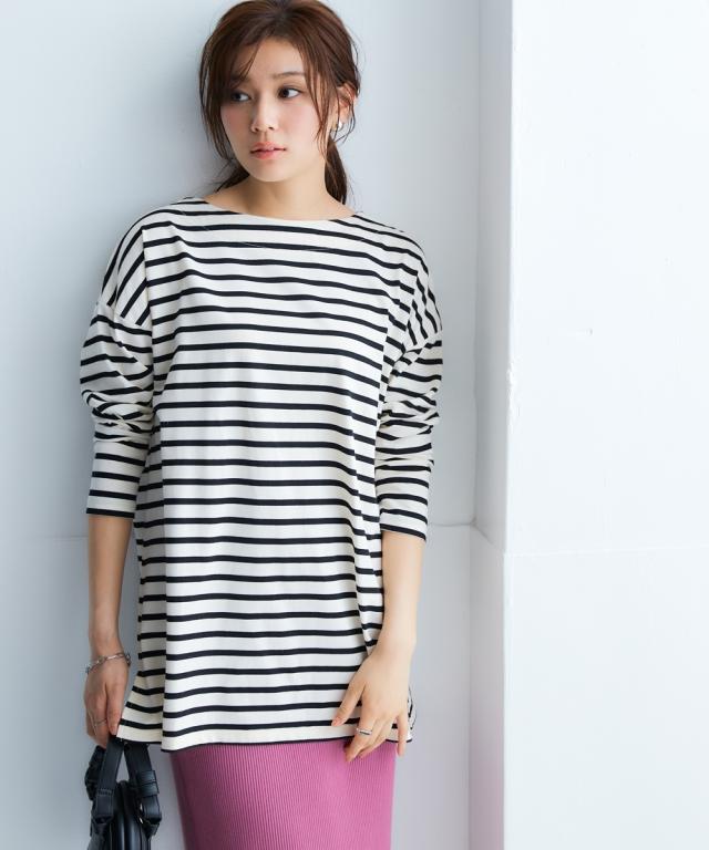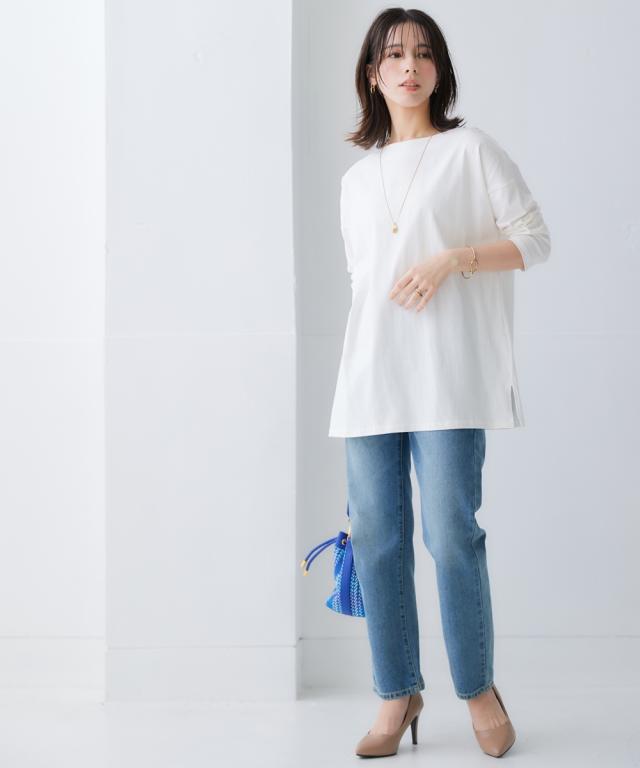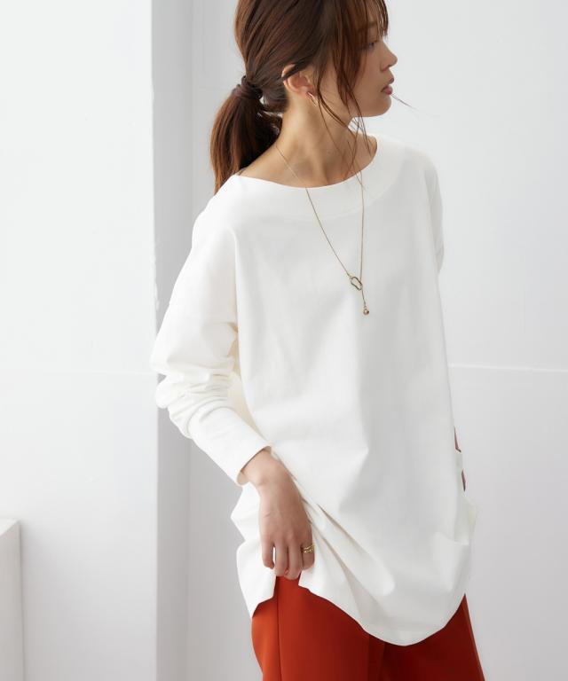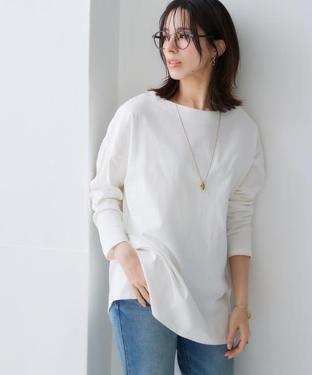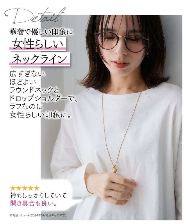 広すぎず程よいラウンドネックとドロップショルダーで、ラフなのに女性らしい印象に。