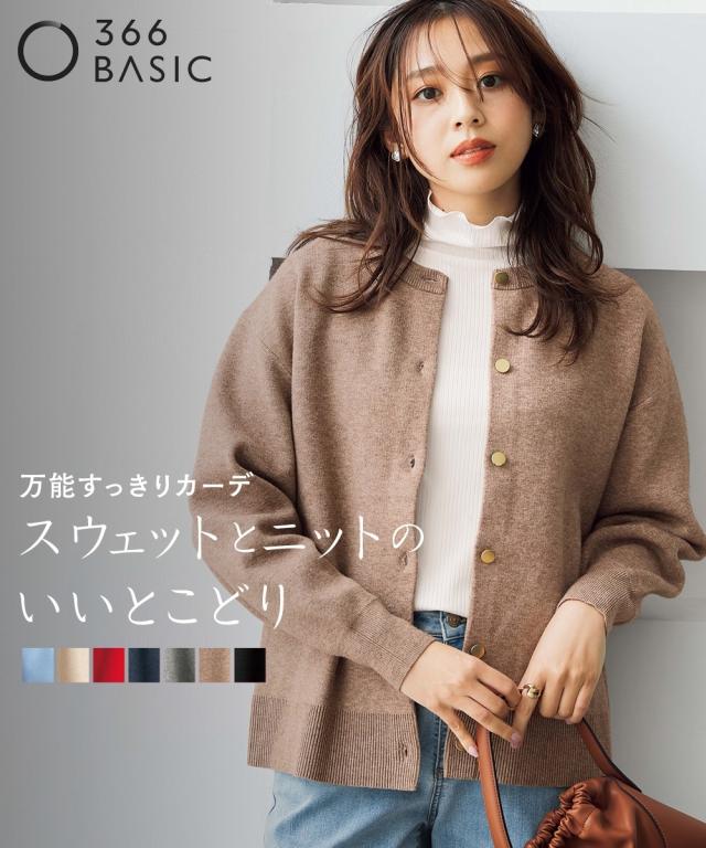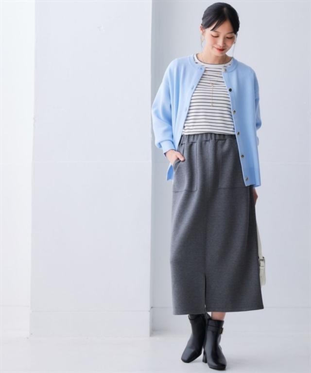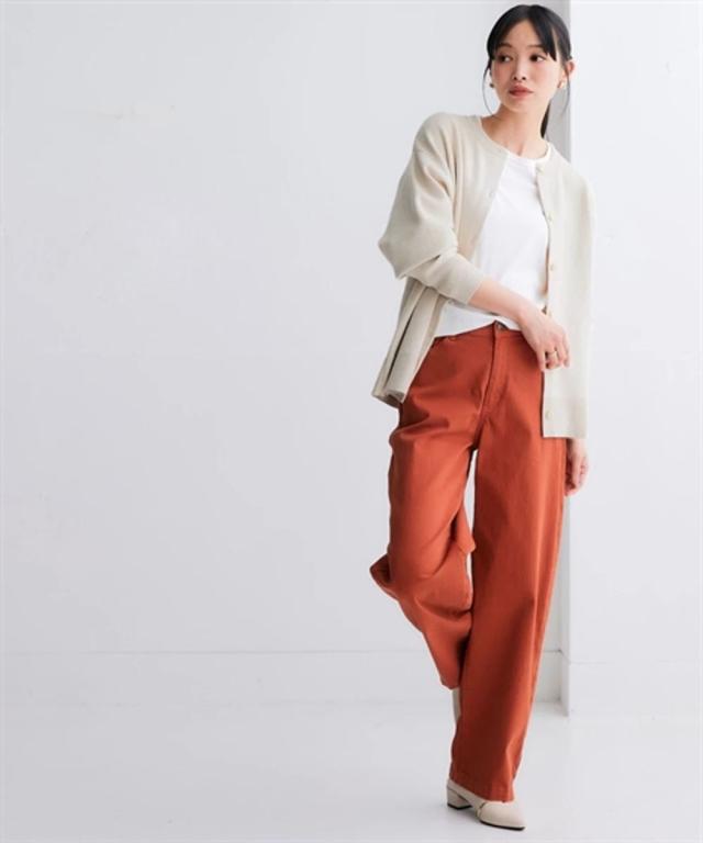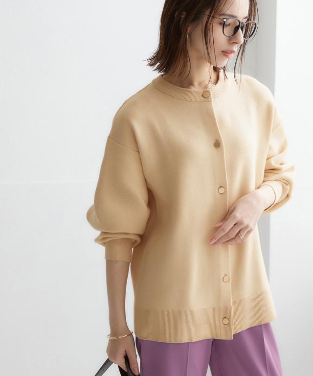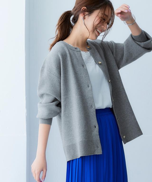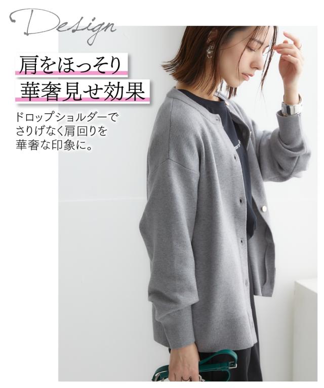 きれいめに見えるニットカーディガンなので、光沢感のあるスカートと合わせたり、あえてデニムとカジュアルに合わせたり、着方次第で何通りも楽しめる本当に万能な1着です。