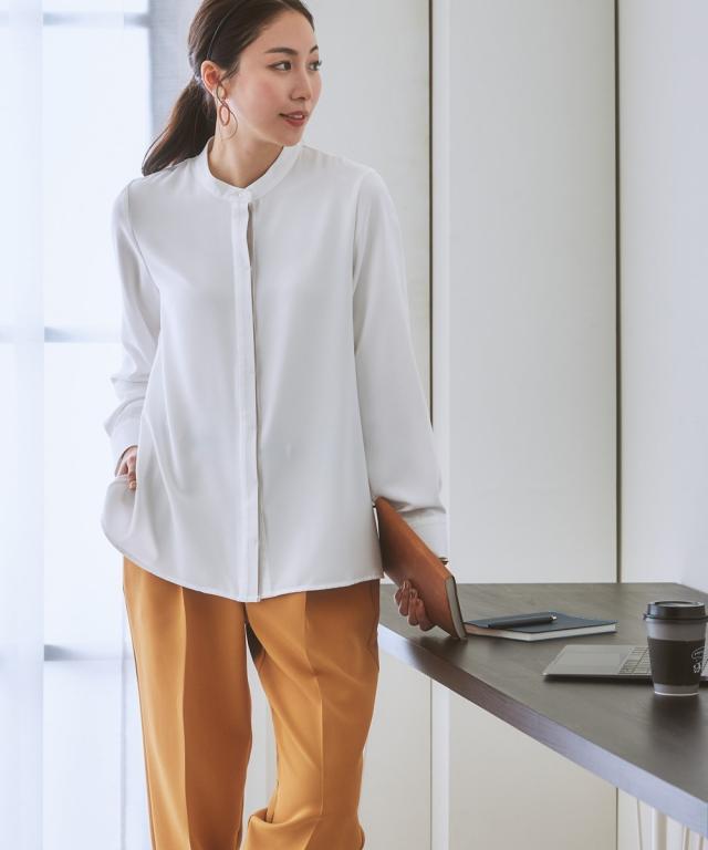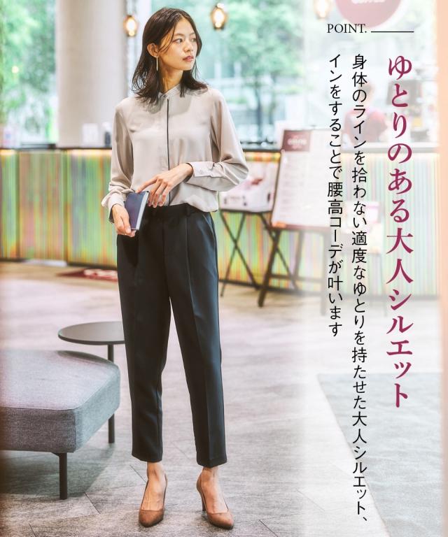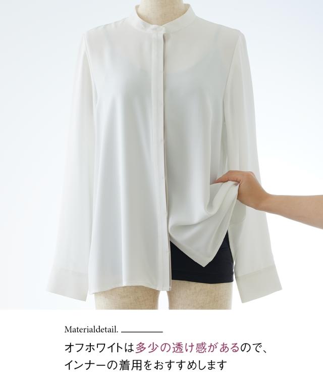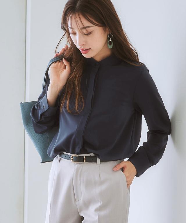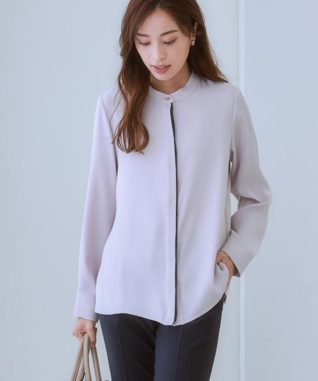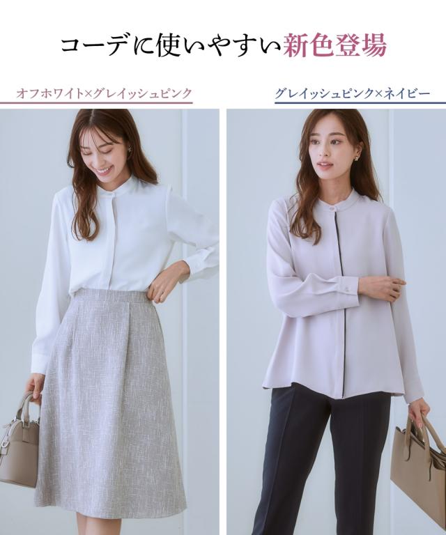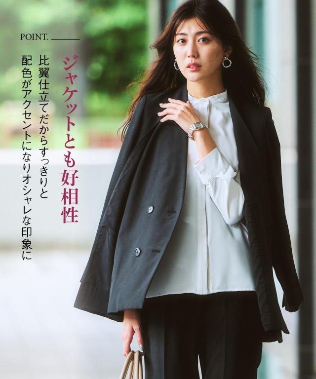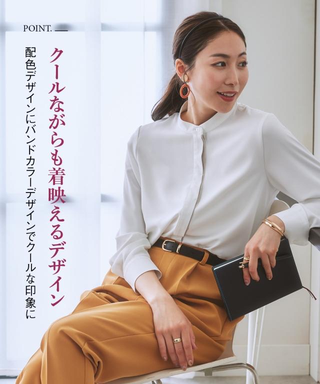 オフィスモニターさん太鼓判!さらっと心地良く、女性らしいとろみ感も兼ね備えたパウダーサテンで仕立てた華奢映え配色ラインのハンサムブラウスです。 ■デザイン ・さりげない大人な配色使いでクールながらも着映えます。・すっきりみせるボタンを隠した比翼デザイン。・配色がアクセントになり、ジャケットとも好相性。・ゆとりのある大人シルエット。・背中はタックを寄せて、体の丸みをカバー。 ■素材 とろんと肌の上をすべるなめらかパウダーサテンです。働く女性の毎日をサポートする、「しわになりにくい・速乾・洗濯機OK・UV