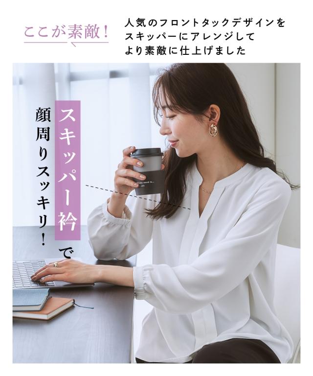 [keyword] レディースファッション 標準サイズ 普通サイズ 長袖 おしゃれ 防しわ アイロン おでかけ 洗濯機洗いOK 洗濯 UVカット 夏 外 イベント 肌 レジャー ストレッチ 伸び [comment] オフィスモニターさん太鼓判!さらっと心地良く、女性らしいとろみ感も兼ね備えたパウダーサテンで仕立てた顔まわりすっきりのスキッパー衿ブラウス ■デザイン ・人気のフロントタックデザインをスキッパー衿にして顔周りすっきり。・背中ののっぺり感を解消するタックデザイン。・プッシュアップしやすい袖口ハーフゴム仕様。・ジャケットインを考えて袖口から出てこない袖丈。 ■素材 とろんと肌の上をすべるなめらかパウダーサテンです。働く女性の毎日をサポートする、「しわになりにくい・速乾・洗濯機OK・UVカット」を兼ね備えた優秀機能素材です。 ■おすすめのスタイリング ・スカートでもパンツでもバランスよく着用いただけます。小物を変えて、フォーマルシーンにも活躍。