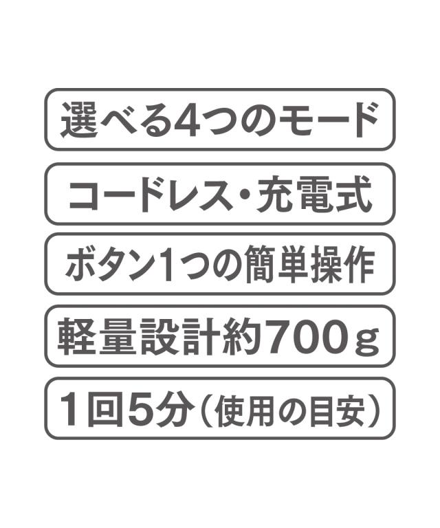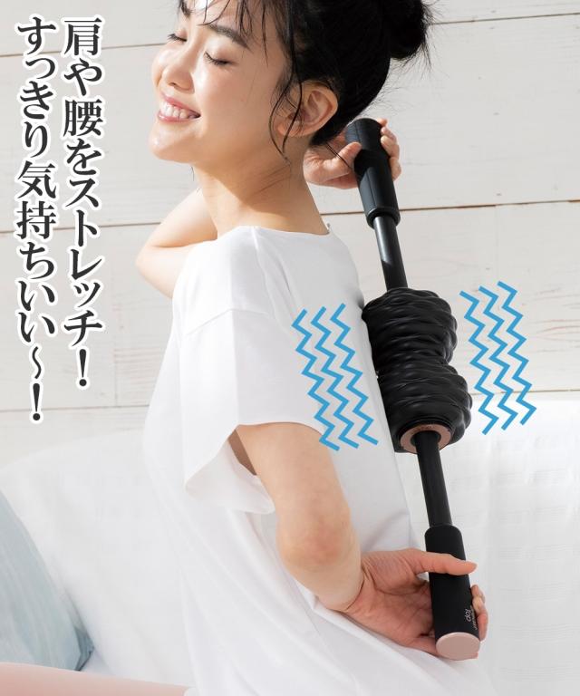 [keyword] コスメ 美容 健康 痛み コリ 首 ケア 肩 背中 猫背 姿勢 背筋 腰 ボディ 身体 体 [comment] 肩や腰のつらさの元ガチガチ背中を解放する!! 全身を気持ちよーくストレッチ!! 伸縮バーで伸びるから届きにくい背中の筋肉も楽々刺激! 選べる4つのモード コードレス・充電式 ボタン1つの簡単操作 軽量設計約700g 1回5分(使用の目安) 最大毎分5000回の振動