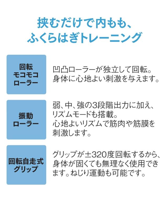 ●セット内容:本体、充電用ケーブル(50cm)、取扱説明書(保証書付) ●サイズ:本体(伸長時)=(約)幅100×奥行620×高さ98mm、本体(縮小時)=(約)幅100×奥行466×高さ98mm ●重量:約700g ●材質:ローラー=発泡EVA、グリップ=シリコーン、ナイロン、グラスファイバー、伸縮バー=ナイロン、グラスファイバー ●消費電力:最大2.4W ●充電時間:約140分 ●連続使用時間:約110分●タイマー:各モード5分(連続使用時間)自動電源OFF機能 ●グリップ回転角度:約320度 ●振動